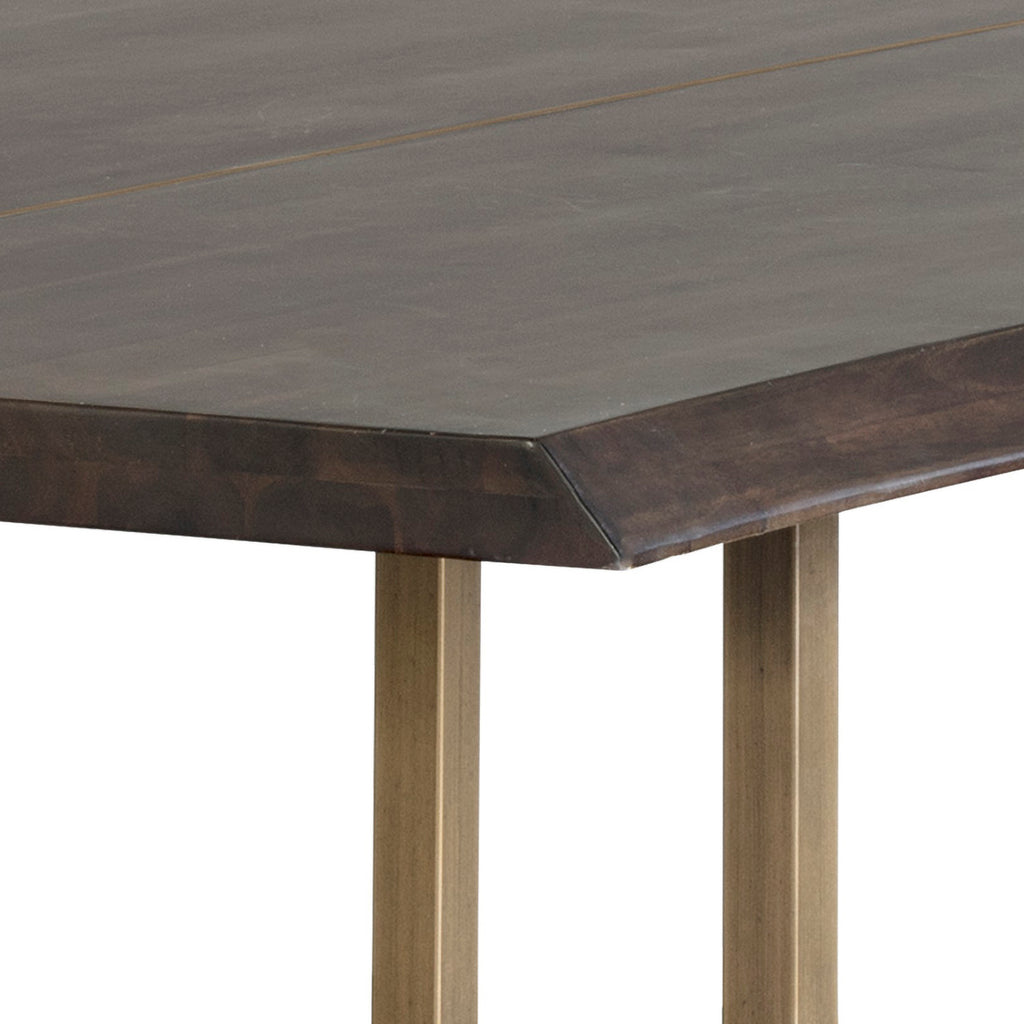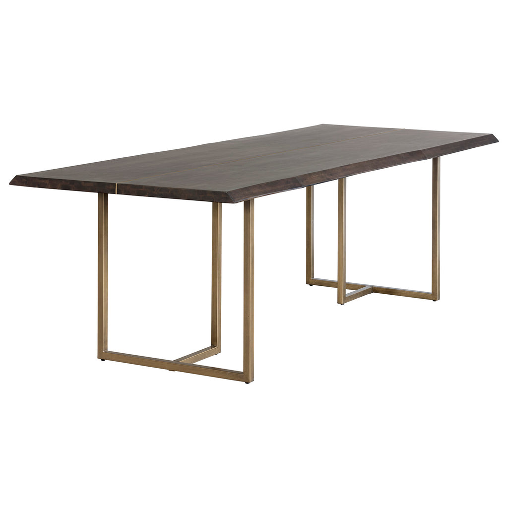 This dining table will create an elevated rustic environment. Features a smoked acacia wood top and is complemented with an antique brass frame. Suitable for residential and contract environments.