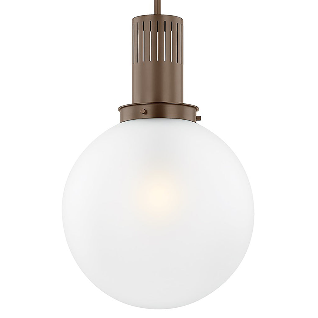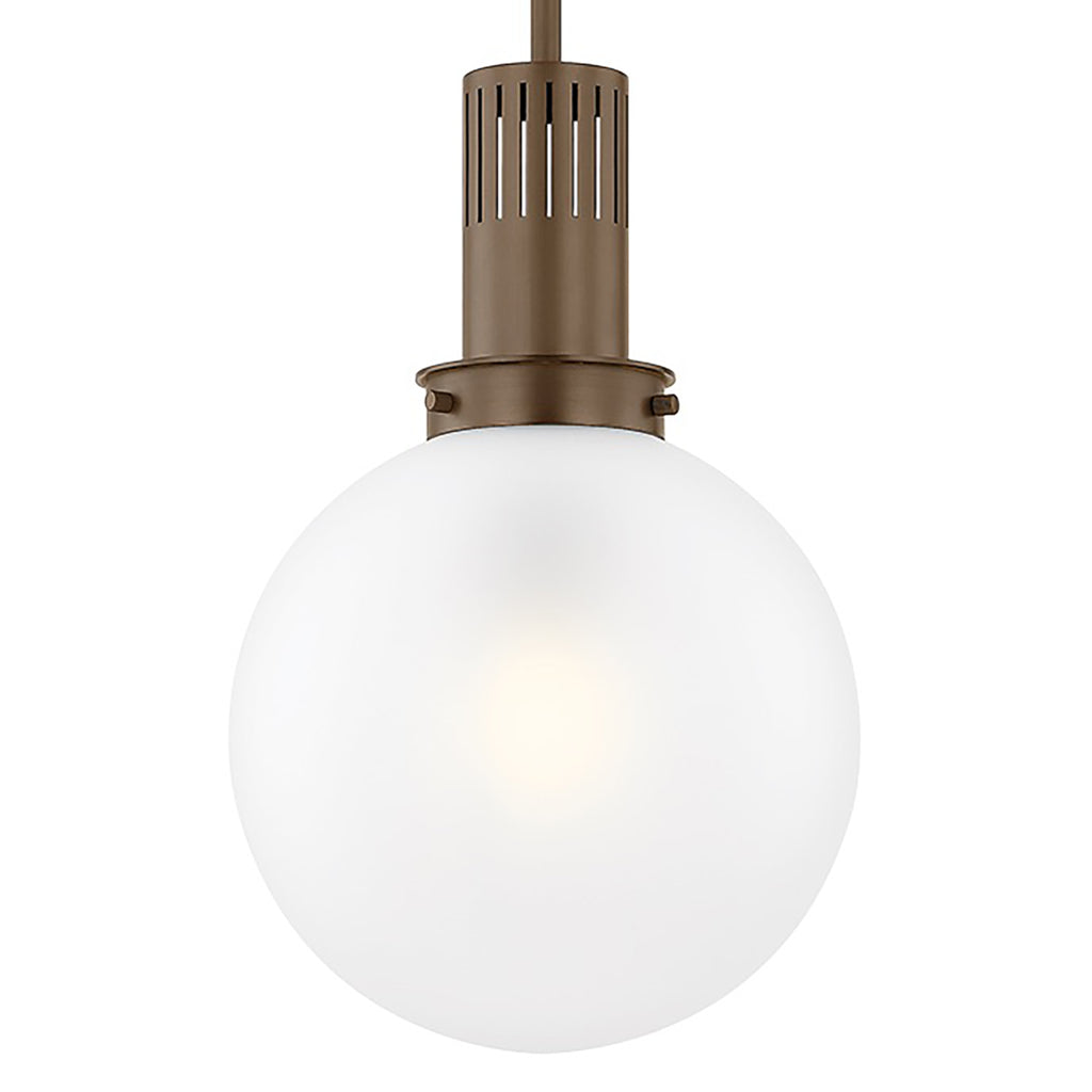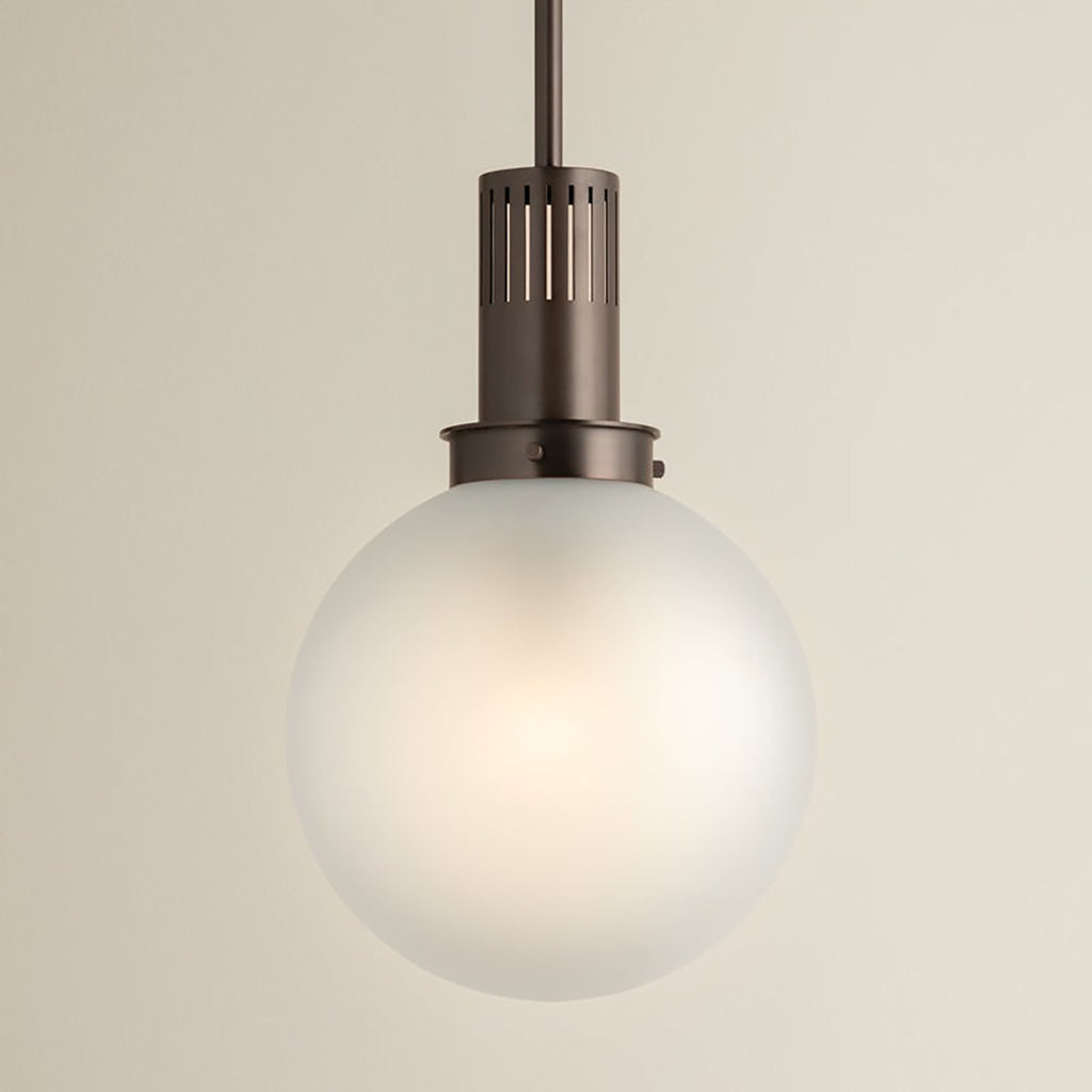 Troy Tobias Pendant is a recognizable basic with a cool, modern feel. The oversized glass globe has been internally etched to add texture, but the real star of this pendant is the industrial-style chimney. Perforated with elongated slats, it sets the tone with either a Patina Brass or Bronze finish. This modernized retro staple comes in two sizes to suit your spatial needs.