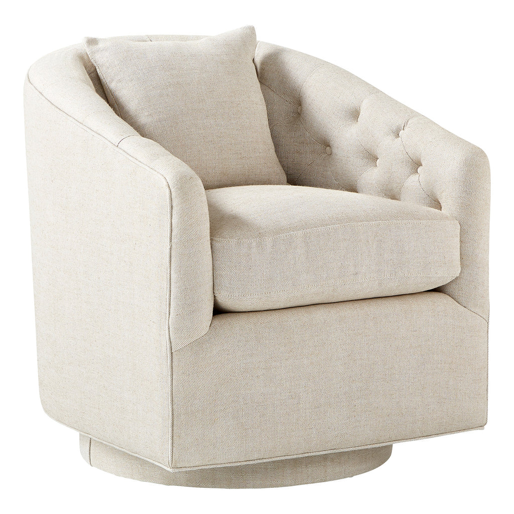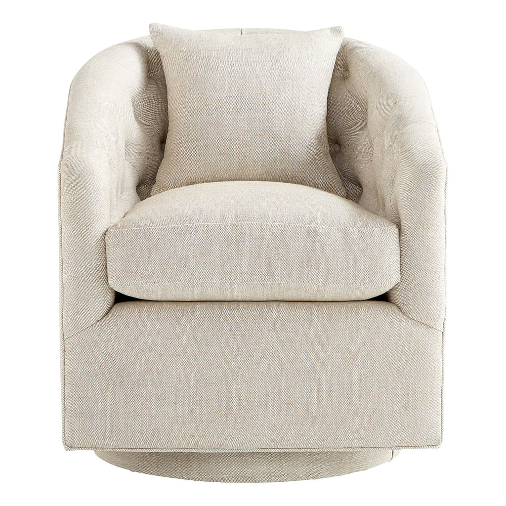 With a casual design and modern shape, the Cyan Design Occassionalle chair fits effortlessly into any space. Cream or Grey fabric lines the sophisticated exterior, which features down sloping arms and a rounded shape, with full swivel capabilities for added versatility. Fit a pair into your living room or den ensemble for an elevated level of comfort.