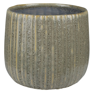 Ceramic with a textural bubble glaze gives this cachepot a truly unique look. This on trend offering finds a home indoors or makes a statement in an outdoor garden setting.