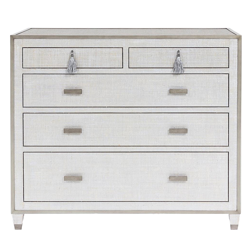 The Argento chest of drawers is inspired by finely textured, intricate Florentine silverwork, mixing soft shine and modern silhouettes. Each piece mixes silvered raffia coverings with pewter metal trim. Mixing function and aesthetics, this chest is perfect for storage and top two drawers of this are lined. Generous but not oversized, this bit of modern gilding is tailored but also opulent.