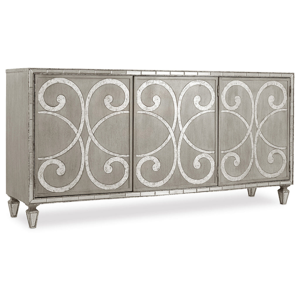Create a luxe atmosphere with this glamorous buffet with dual-function capability as an entertainment center to accommodate up to a 75-inch TV. Crafted of Poplar and Hardwood Solids, it is adorned with the Epoque finish, a greige with shimmer on Oak veneers. Three doors with touch latches have one adjustable shelf behind each door.