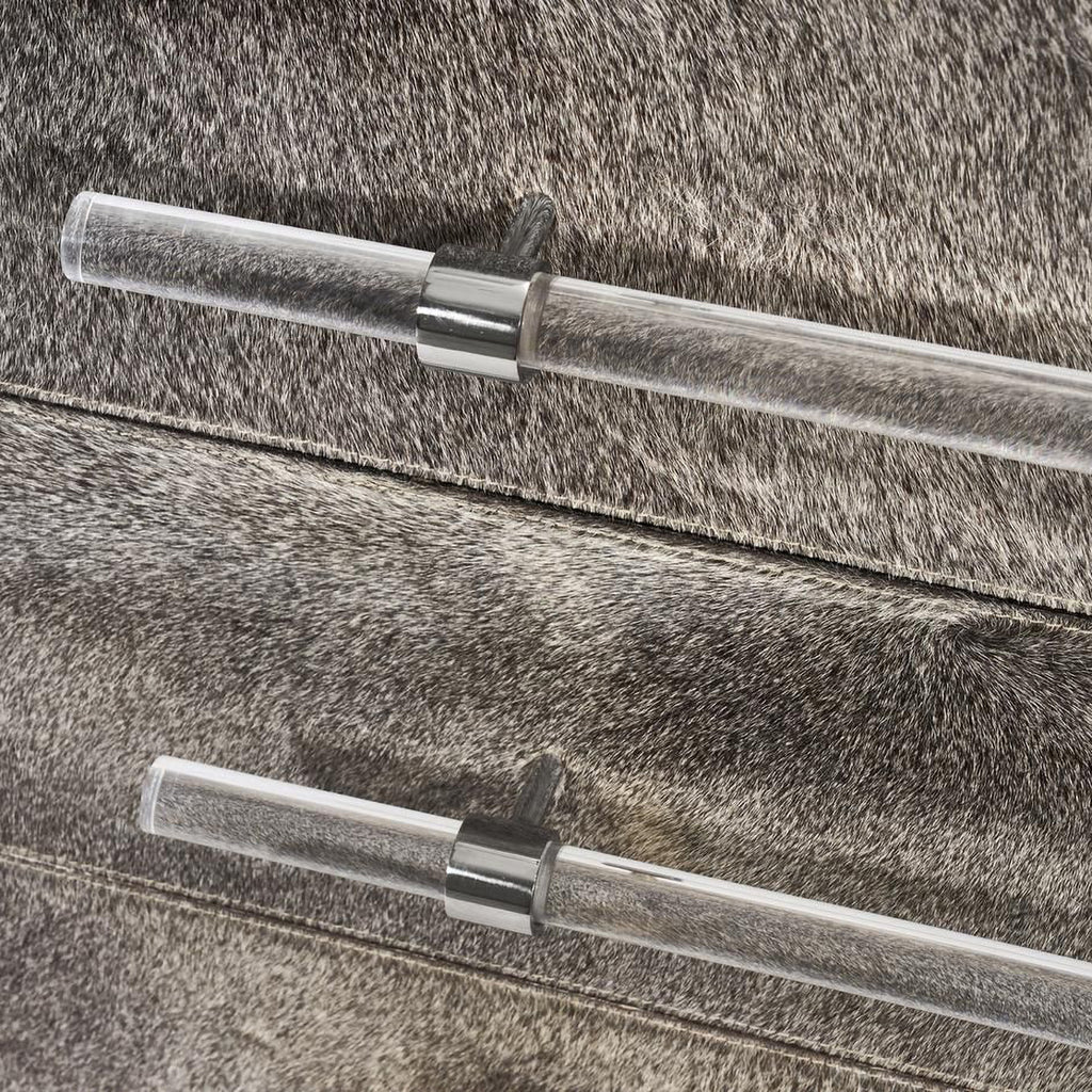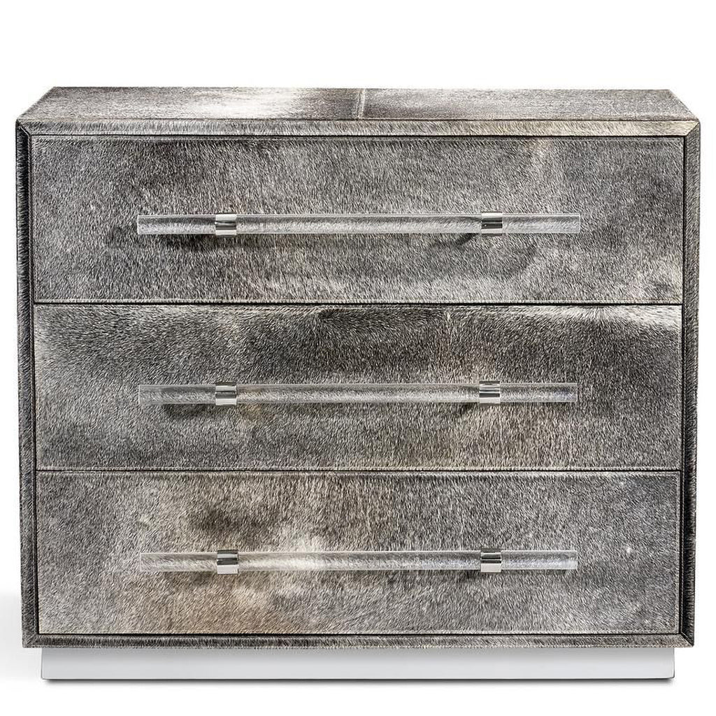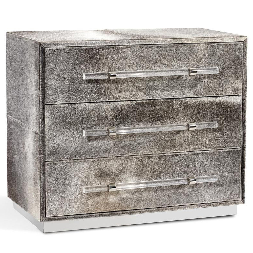 Light natural grey hide pairs with clear acrylic pulls and polished nickel accents to make the Cassian 3 Drawer Chest a totally chic addition to any bedroom. Hide is a natural material. Variations in color are to be expected and add to the unique charm of each piece. Our natural coloration is hand selected to include hides with predominantly grey undertones, but cream, tan and brown hues can also be expected.