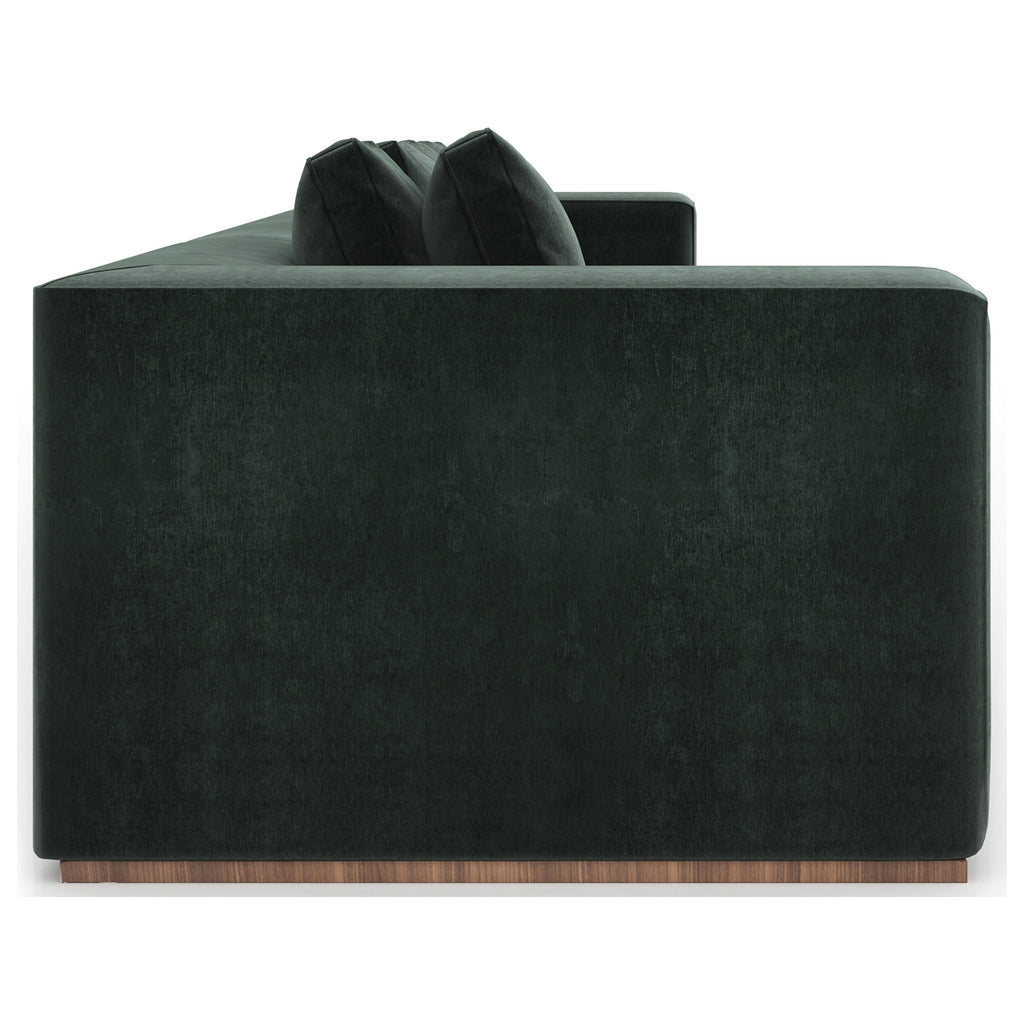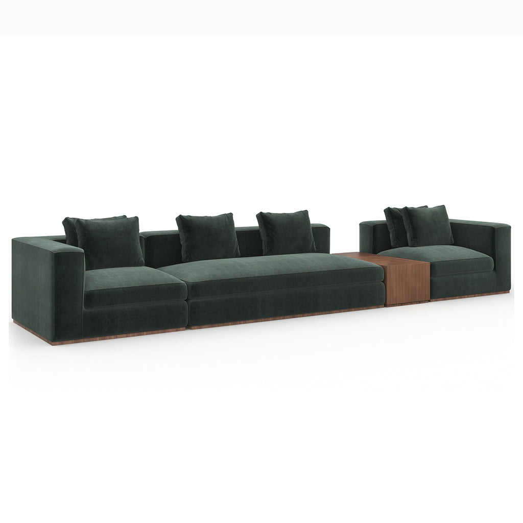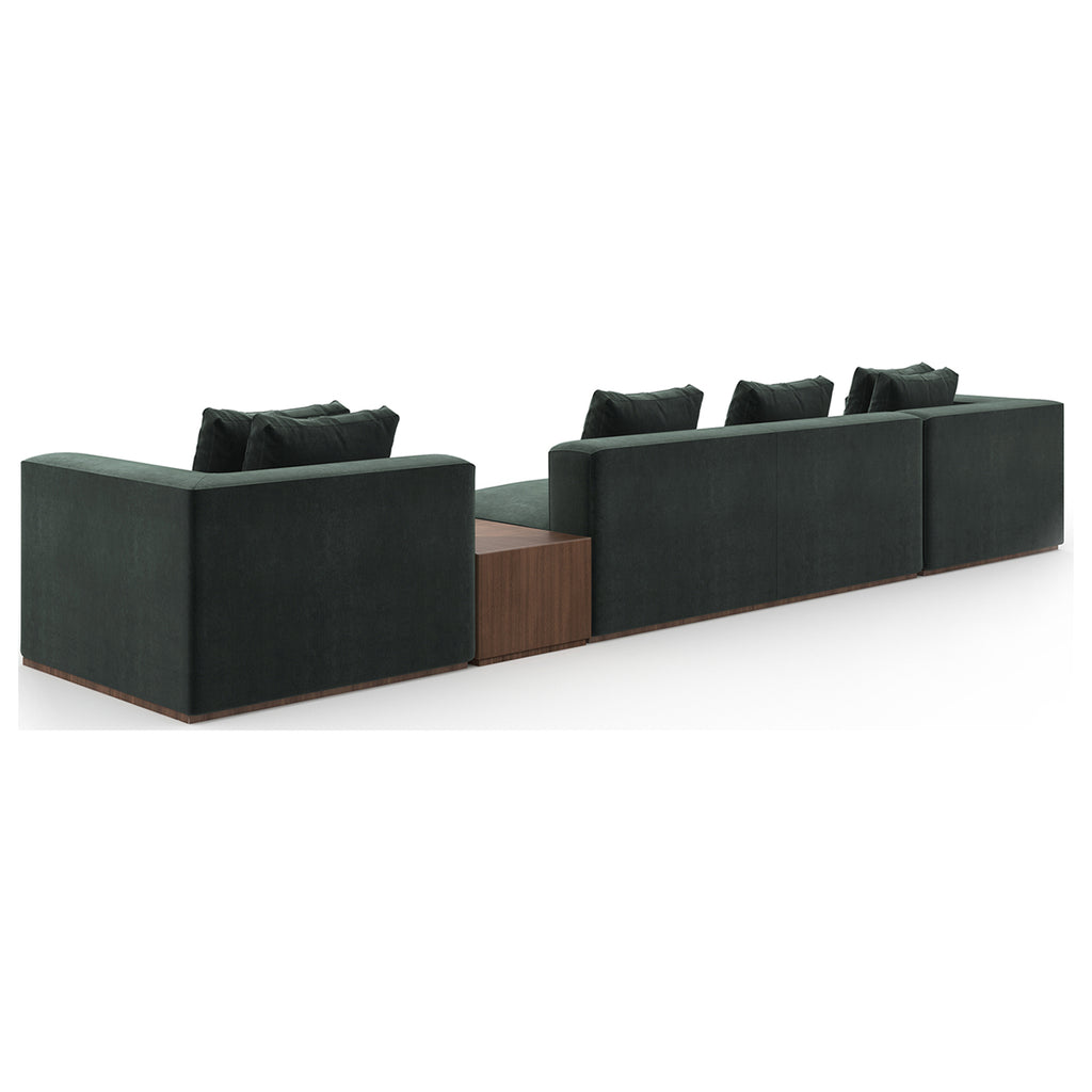 Start your sectional design with the Bello sectional 4 piece that is wide and generously deep with two matching down pillows. Mid-Century Modern style meets today’s casual contemporary looks in the oversized seating of the Bello Sectional Sofa. Designed to meet your room’s unique needs, each piece of this modular unit is fully-upholstered for positioning flexibility and mixes and matches to expand or contract to your space. This sofa has a squared, low, deep design with eight-way, hand-tied Spring down cushions and generous Down pillow-topped cushions, all in luxurious Vintage Velvet in Spruce Green. These sectional pieces rest on a thin plinth base of Retro Walnut. With Bello Rectangle Cocktail Table.