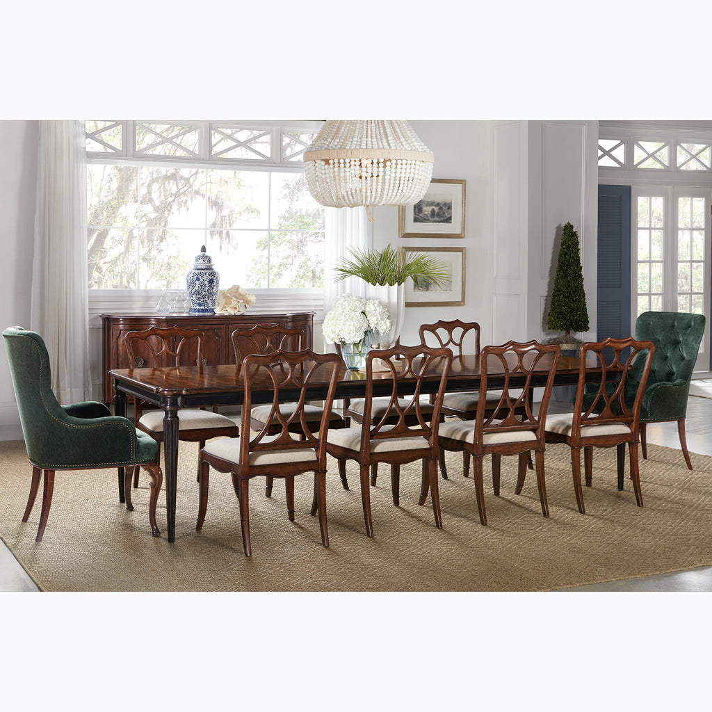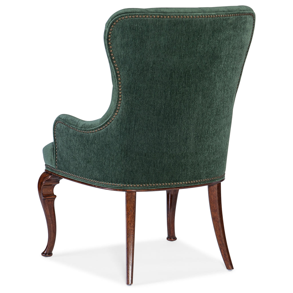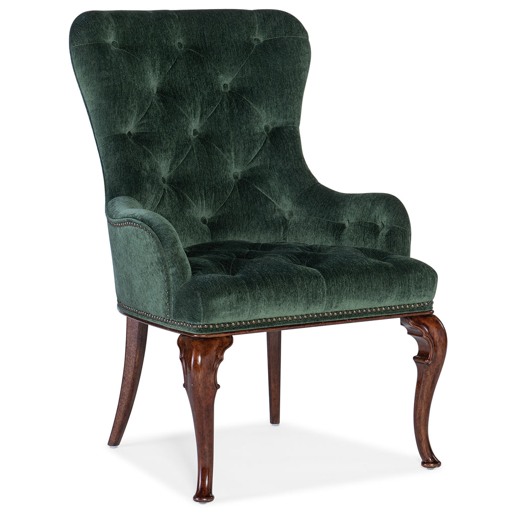 Grand and gracious, the exquisitely-scaled fully-upholstered Charleston Host Chair features delicate button-tufting on the seat and back and is accented with bronze nailhead and welt trim along the seat bottom and outside arms and back. The expansive cabriole legs are finished in Maraschino Cherry using natural grain Cherry Veneers showcasing the dramatic cathedral structure with the selective inclusion of naturally-occurring knots to deliver a rich warm cherry finish and a smooth sophisticated aesthetic.