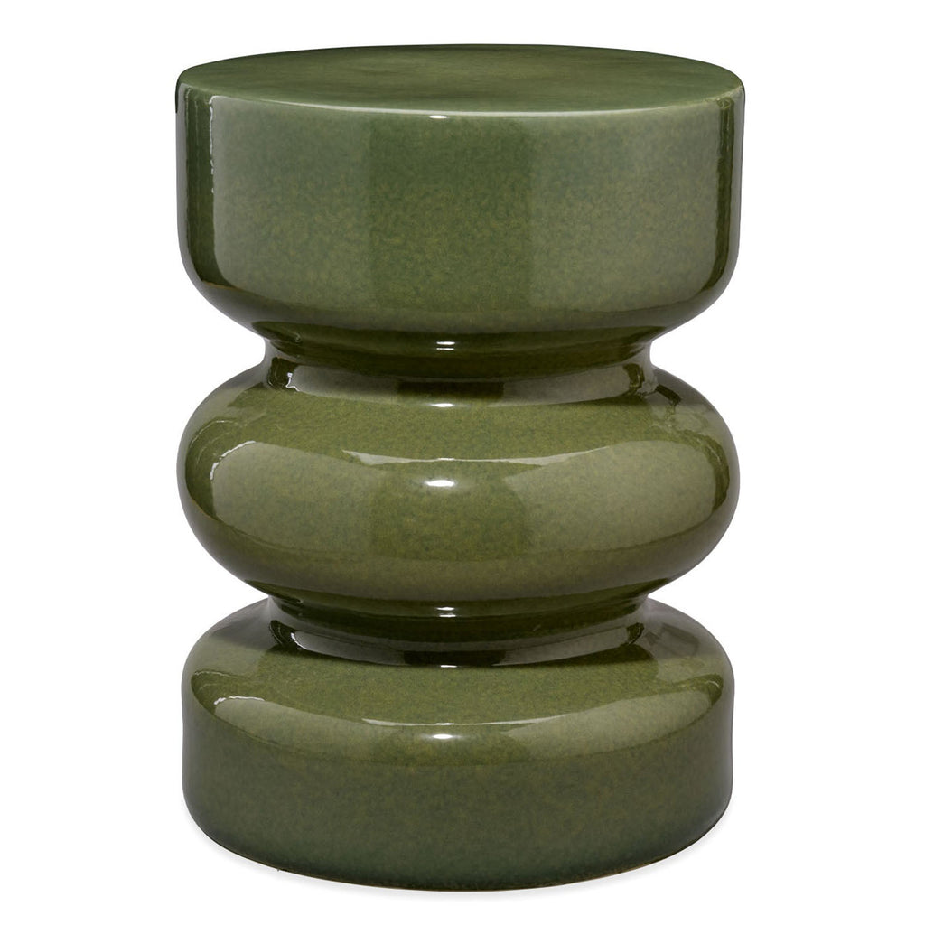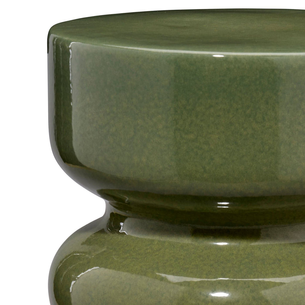 The deep green finish of this ceramic garden stool is achieved through a reactive glaze. This intricate process requires multiple firings, resulting in a unique appearance for each piece—no two are identical. Suitable for both indoor and outdoor areas, this softly curved stool can also double as an accent table.