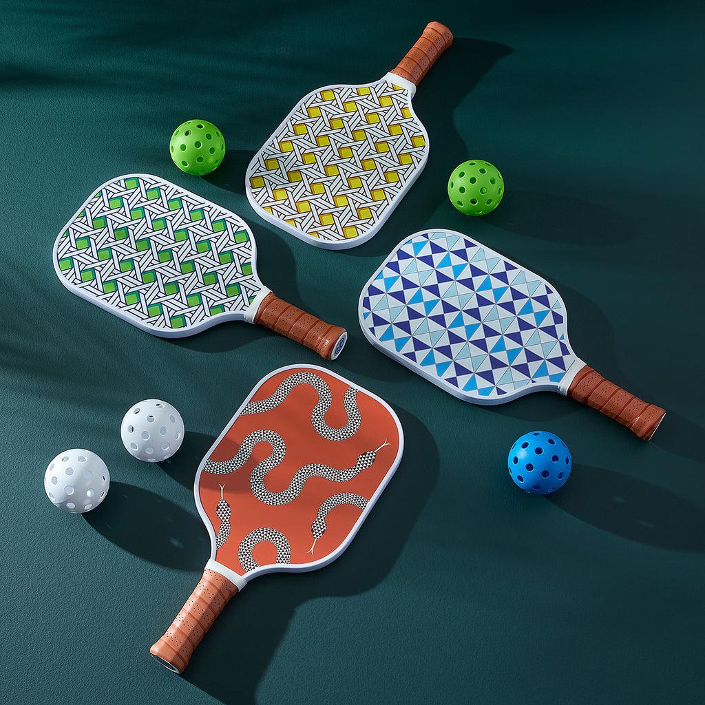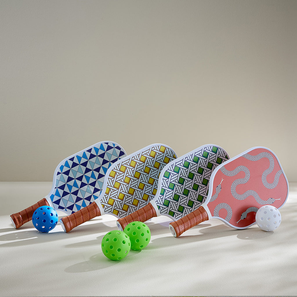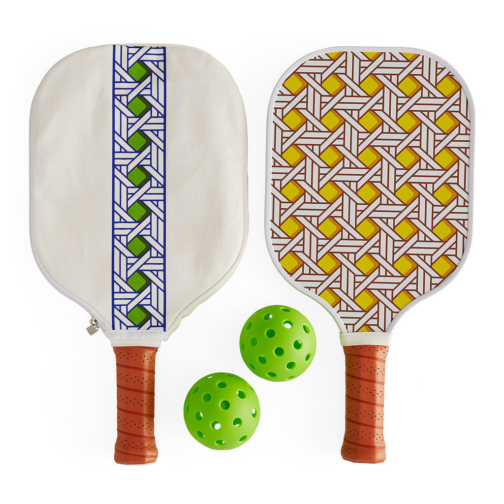 Elevate your pickleball game with our Basketweave paddles and balls. Each set includes two paddles printed with our take on the traditional basket weave pattern (think style points scored before you even hit the court). Leather wrapped handles ensure a comfy grip, and printed canvas covers keep your equipment clean and tidy between matches. Two balls included.