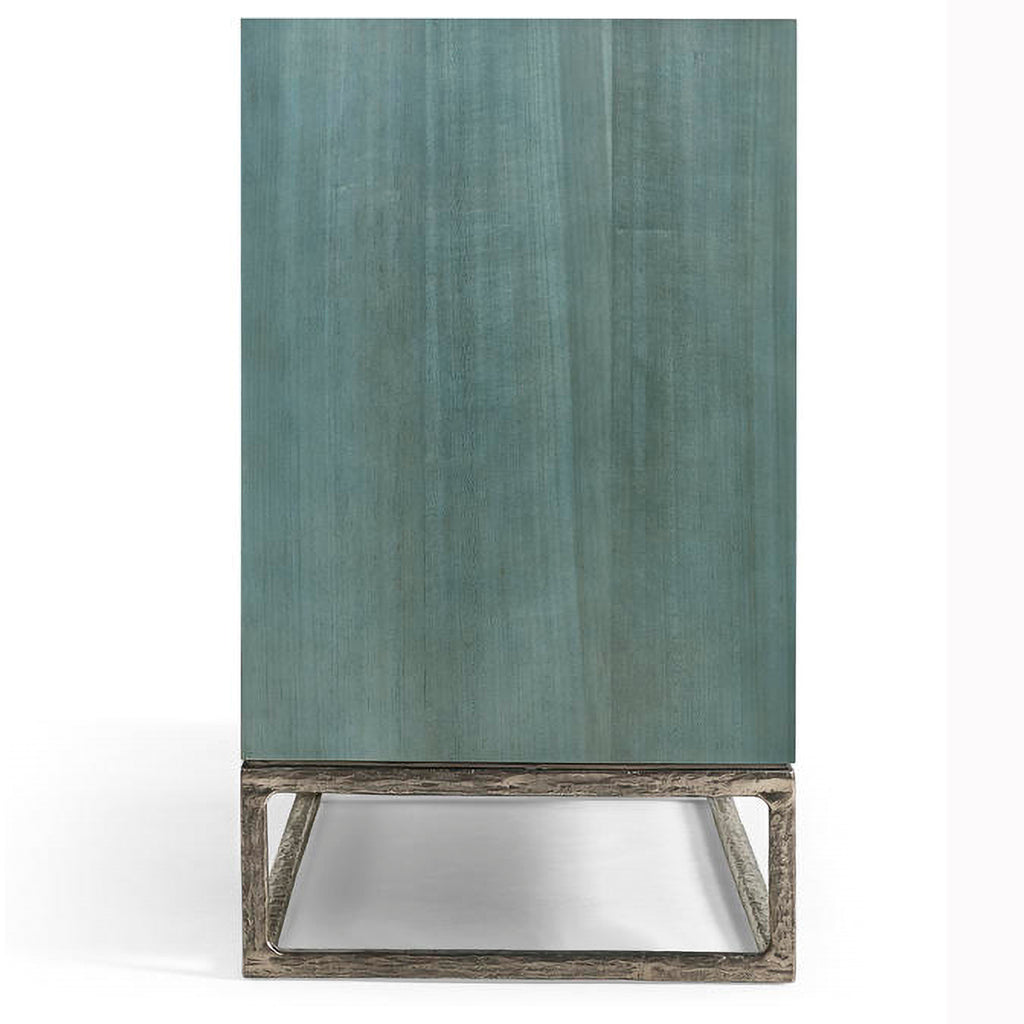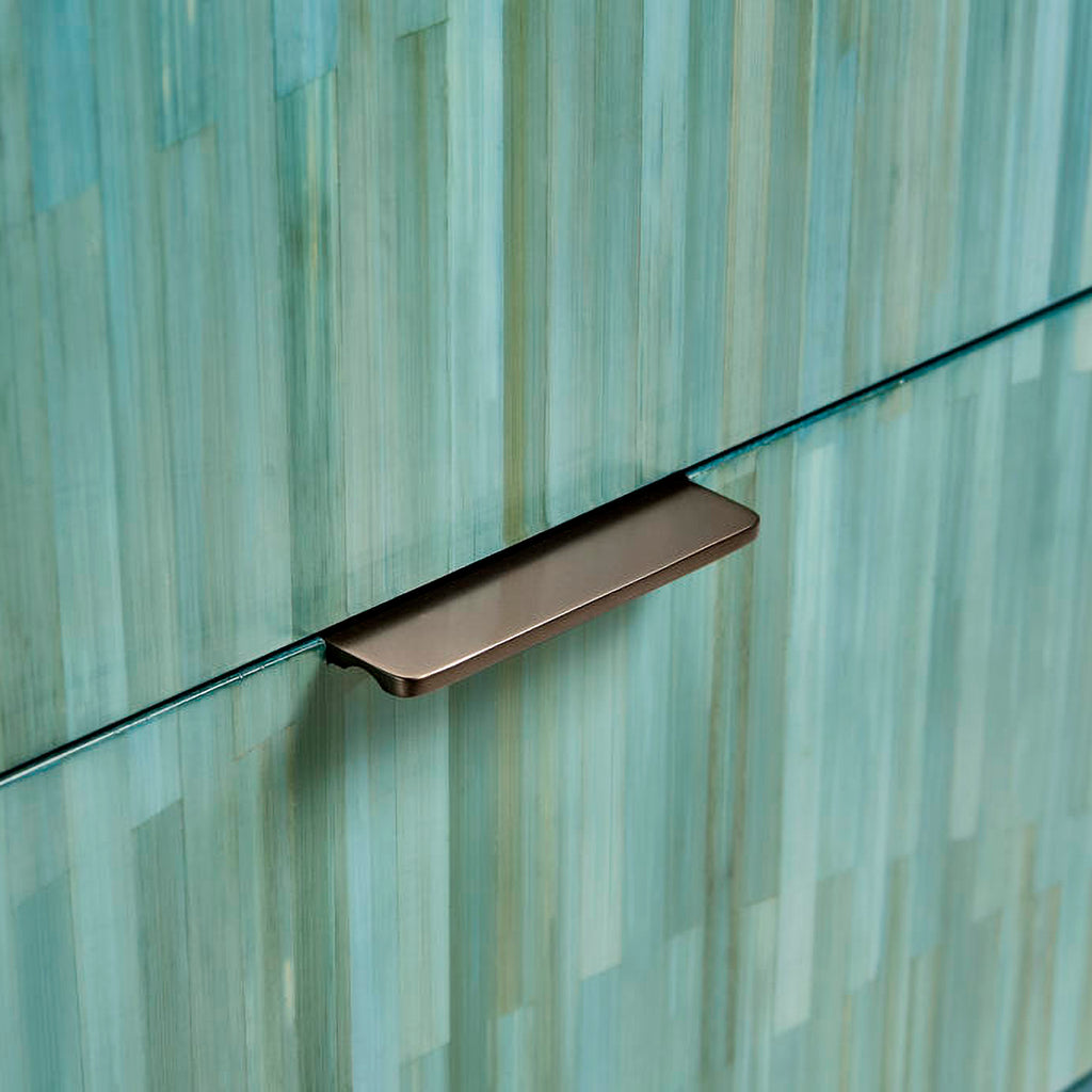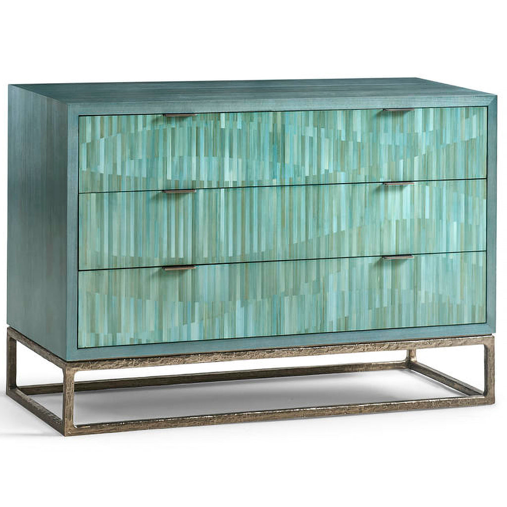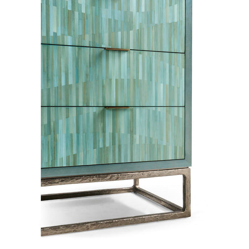 Introduce a touch of artistry to your living space with the Seaglass bunching chest. The exterior is finished in a rich blue koto veneer, offering a sleek and modern look that exudes sophistication. The drawers are the true highlight, crafted from dyed straw sliced and flattened. The meticulous arrangement creates mesmerizing movement with its wave-like patterns in tonal blue hues, adding depth and elegance to the piece. This chest is a perfect blend of style and function, serving as both a practical storage solution and a striking statement piece in any room.