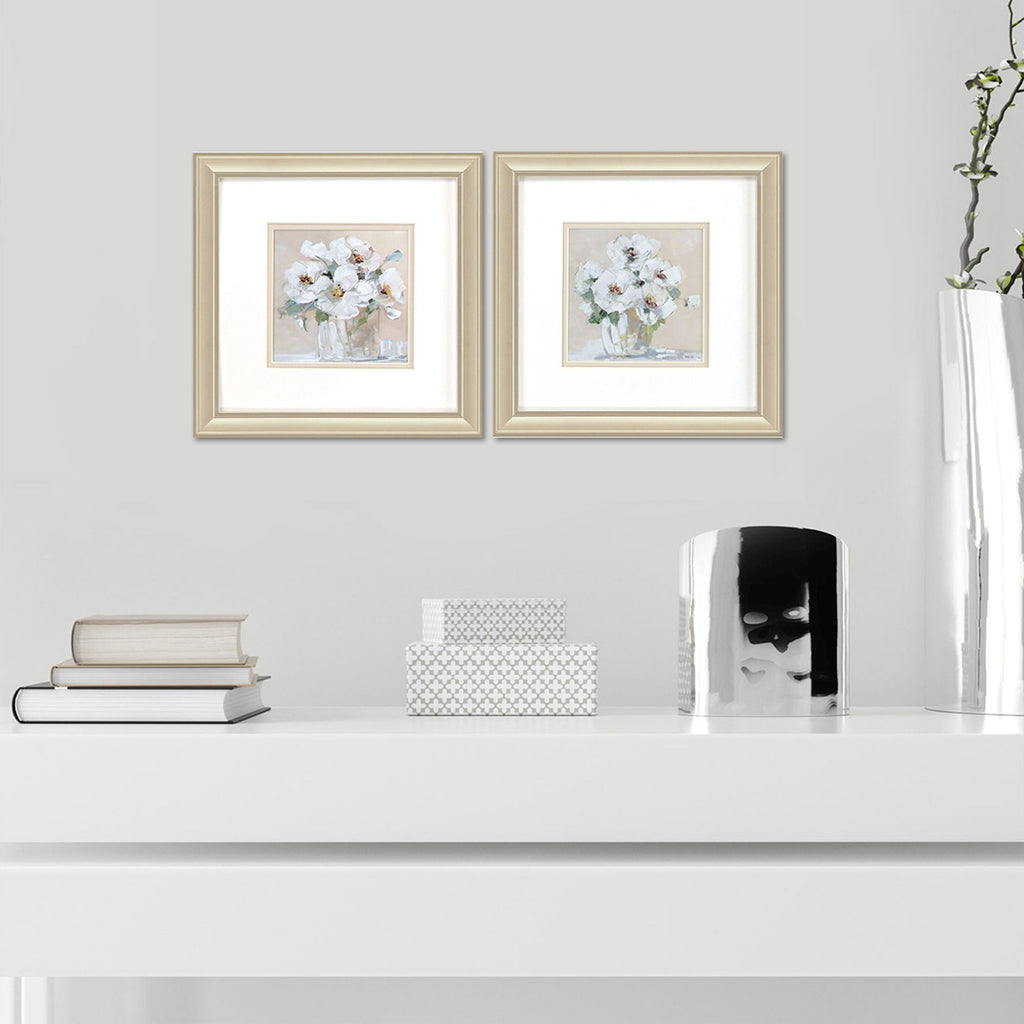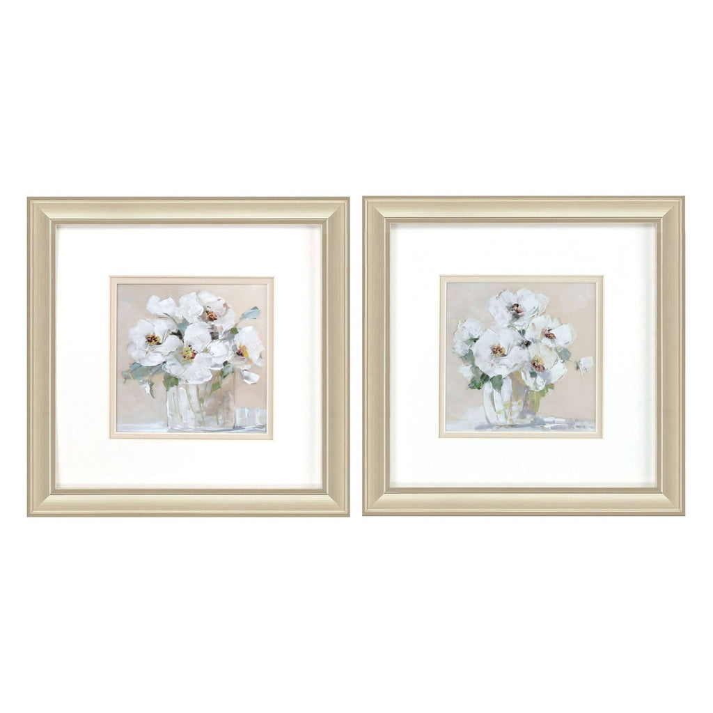 A set of two floral bird images accentuated with double matting. These pieces are framed under glass and paired with a complimenting frame.