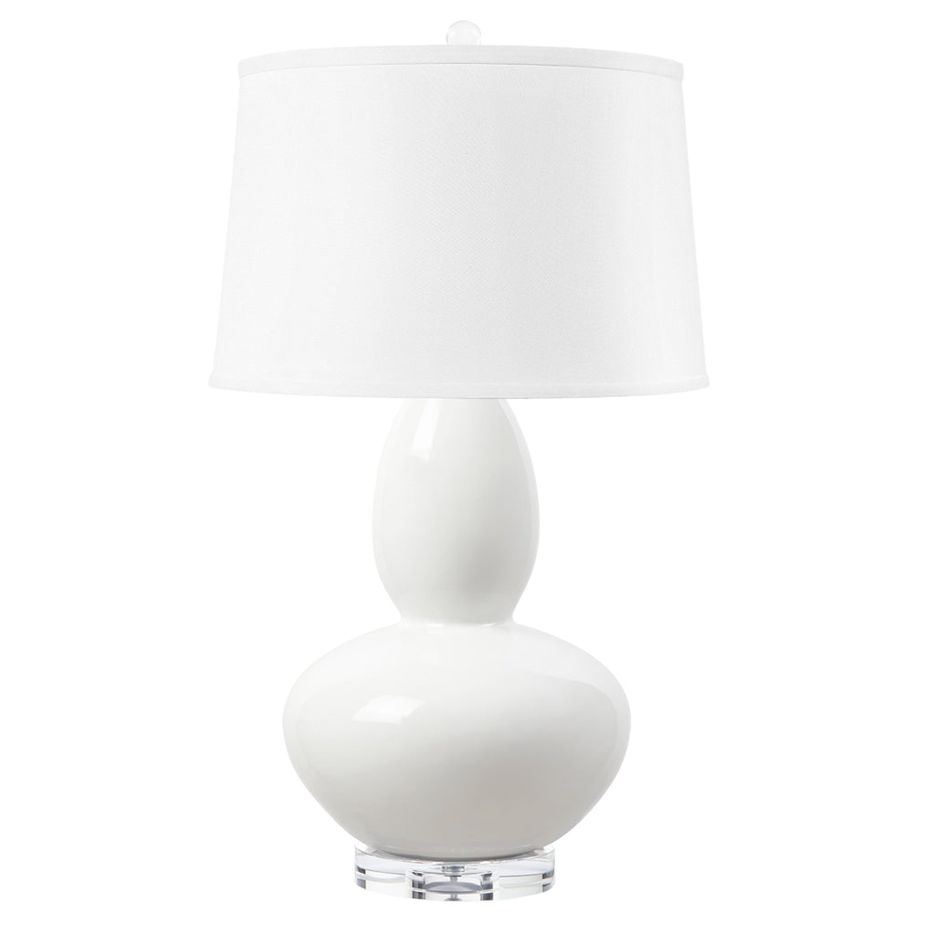 The Villa and House Lisbon Lamp features a contemporary double-gourd silhouette with an oblong top, offering a fresh take on a classic form. Its ceramic body is coated in a thick, lustrous glaze, adding richness and depth to its modern design. Resting on a clear acrylic base and topped with a matching acrylic ball finial, this lamp seamlessly blends sophistication and style. Complete with a nickel harp, the Lisbon makes a cool addition to any interior.