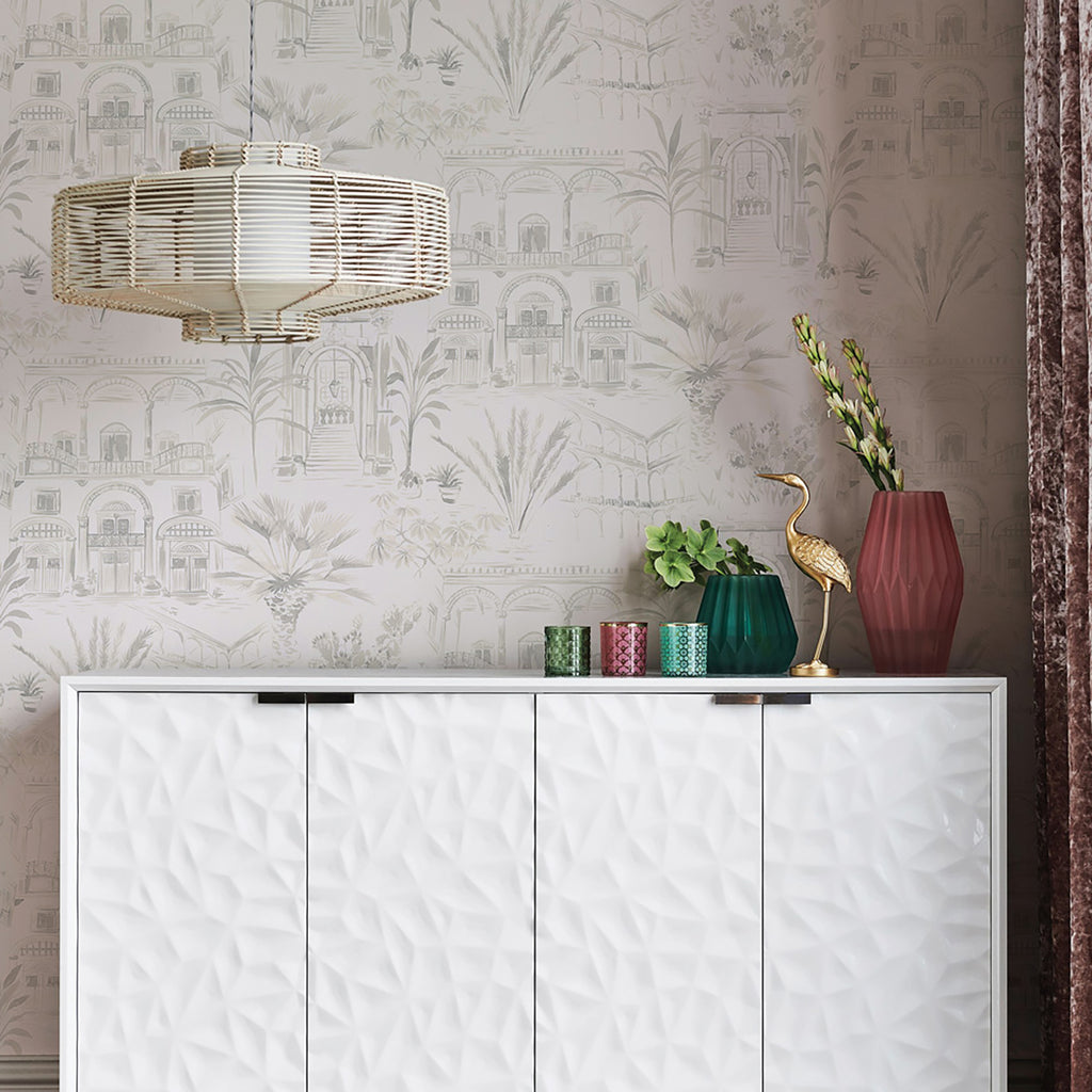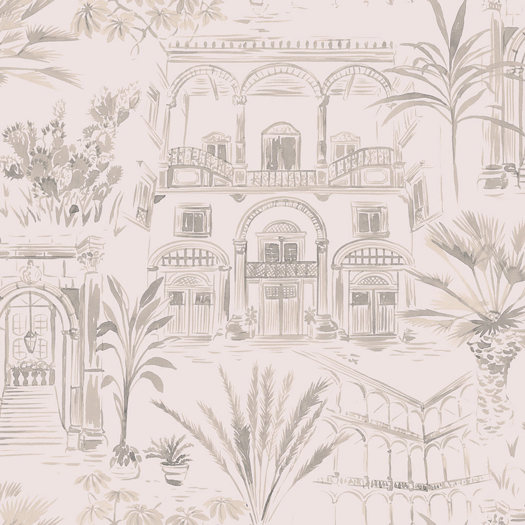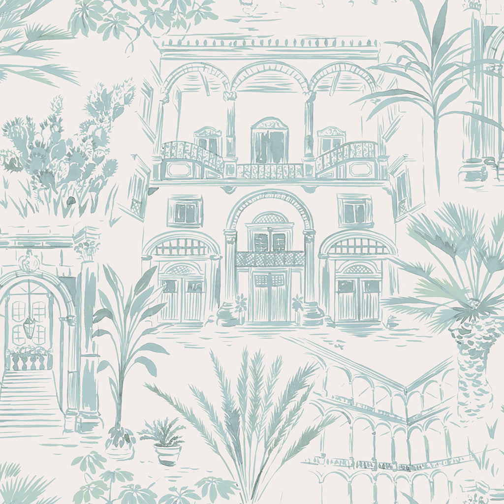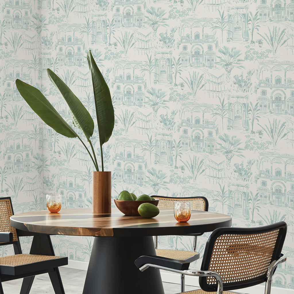 Stroll down this beautiful boulevard and bask in the warmth of the sun. Palm trees and art deco architecture are featured throughout this tropical non-pasted wallpaper design, bringing structure into any space, and transporting you to your favorite faraway destination. Tempaper Boulevard Toile Non-Pasted Wallpaper is available in 3 colorways: coral, gray, and coastal green.