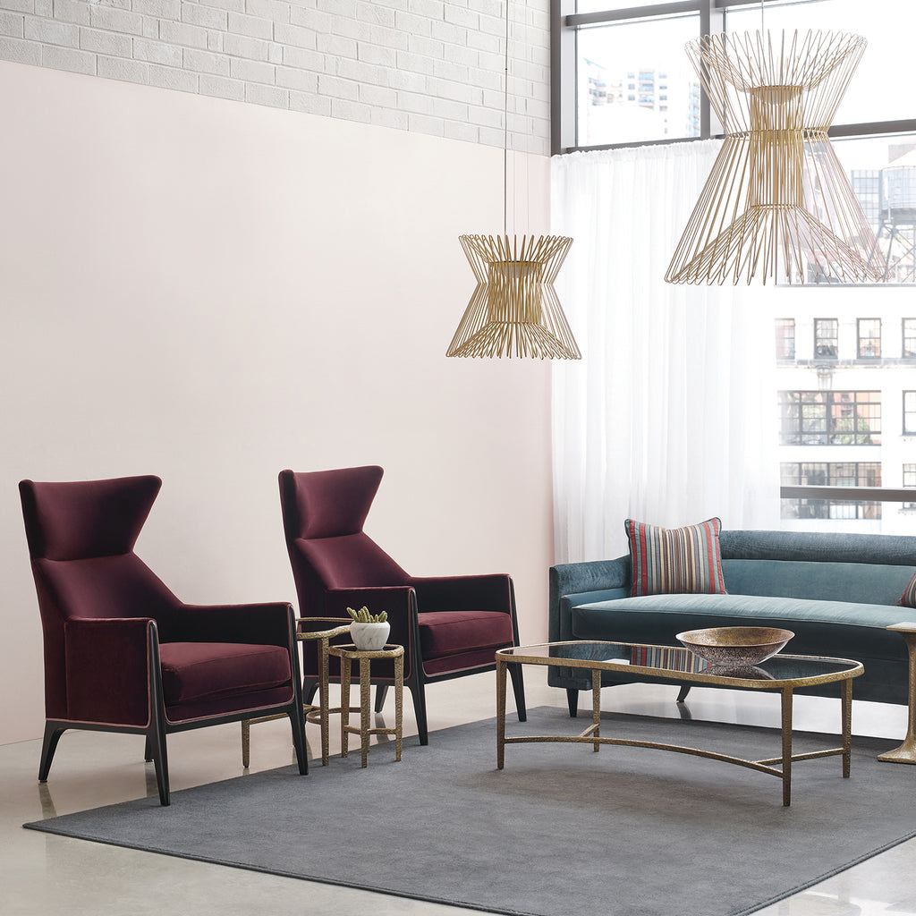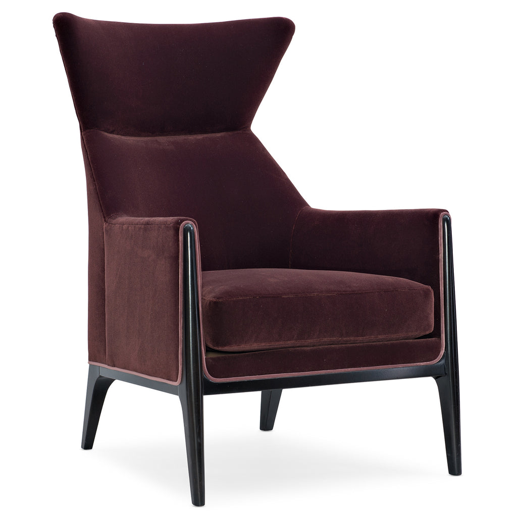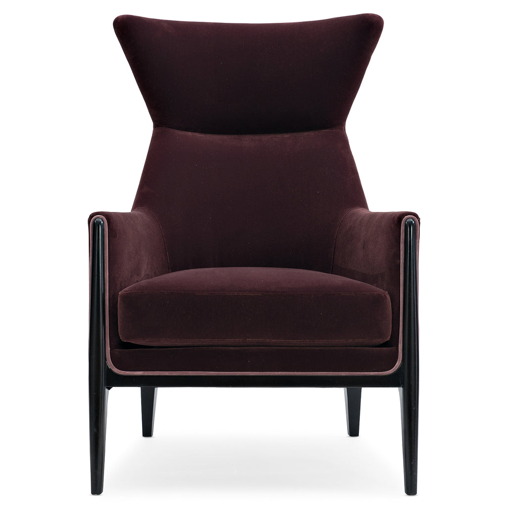 Featuring style that knows no boundaries, this unique chair is rich in color, material and presence. It represents an artist’s interpretation of the classic wing chair and is destined to shine in any setting. Its bold mo-velvet cover is featured in a rich shade of eggplant that shimmers and shines when it catches the light. A coordinating amethyst velvet welt adds another layer of distinction and is complemented with a Satin Ebony finish on the chair’s wood trim. With the power to instantly modernize a space, this distinctive chair works beautifully on its own or as a pair across from a sofa or fireplace.
