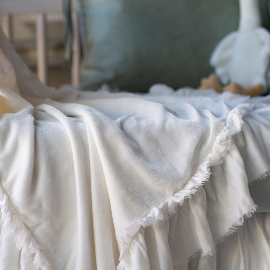 A lovely 4" silk velvet ruffle and petite ruffle trim adorn four sides of the Bella Notte Loulah Baby Blanket, with delicate eyelashes adding a flirty finishing touch to the draping ruffle. Comprised of silk velvet and backed in satin, each silken texture is a dream against baby’s skin. Machine washable and garment dyed to order using our low-impact dyes, this glowing piece will make a beautiful addition to the nursery, and quickly become a favorite of your little one.