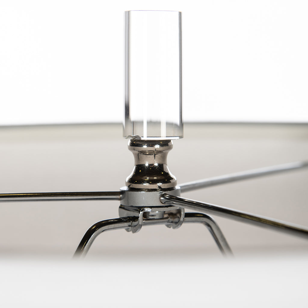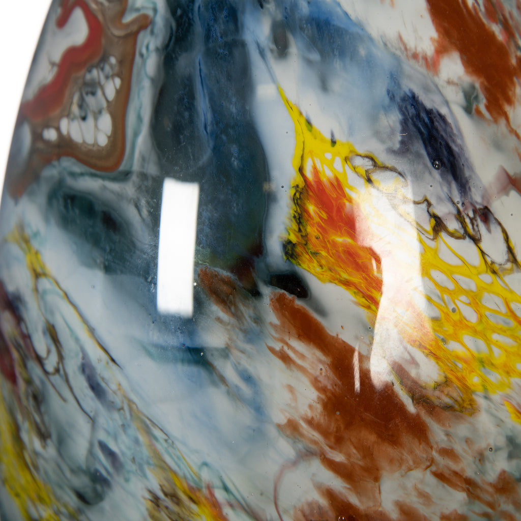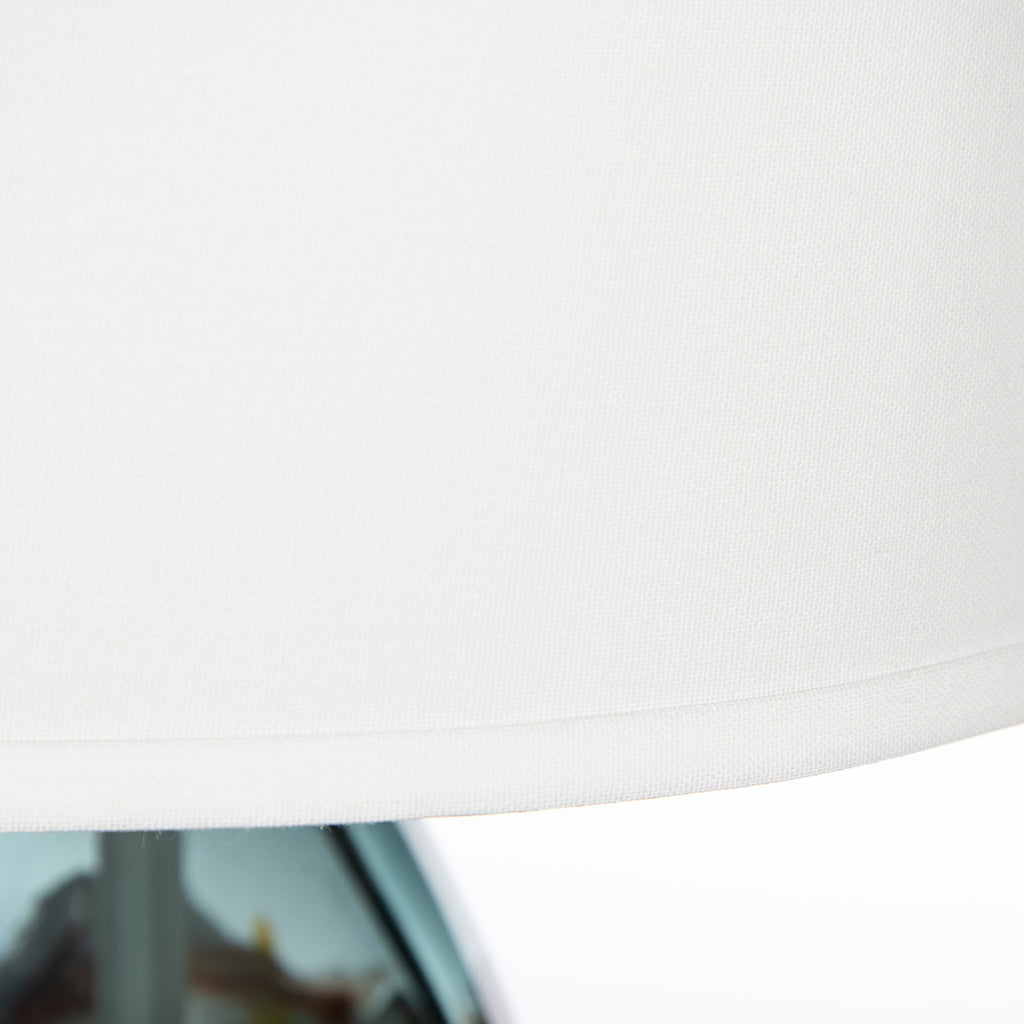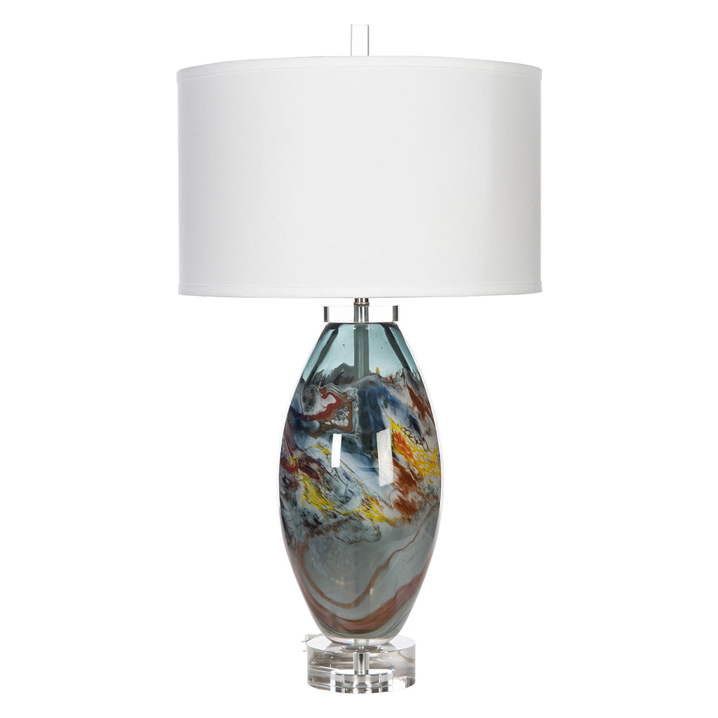 With a craftsmen-like blown glass look and sleek modern elements, this contemporary glass table lamp brings multi-colored swirls throughout the base. Mounted on a complementing crystal disc pedestal base, and topped with a crisp white linen drum shade, fasted by a cylindrical crystal finial, this table lamp offers the perfect modern flair and accent to a space.