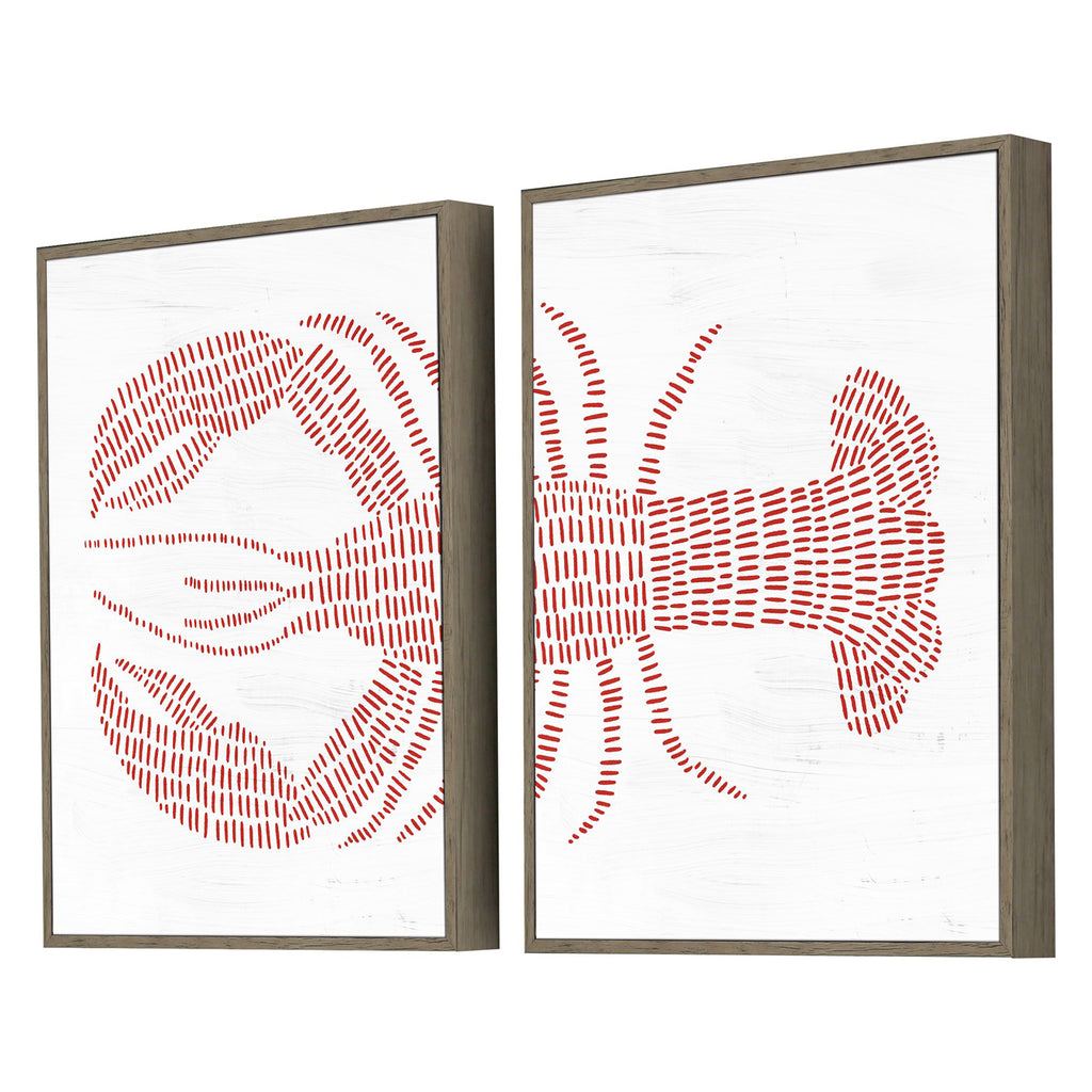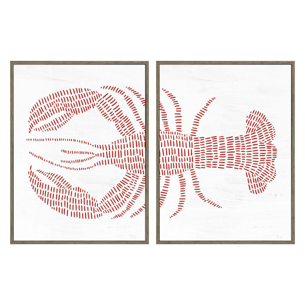 A red lobster diptych makes a modern impression. Featuring an enhanced gel finish and dimensionally framed in a distressed wood finish moulding.