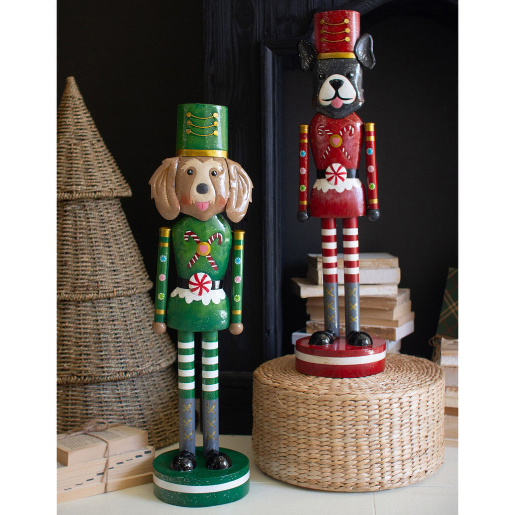 Welcome the season with this set of two painted metal Christmas dog nutcrackers. One is dressed in green and one in red, and they both sport peppermint belts. Add this quirky gift to your cart for a dog lover or white elephant.