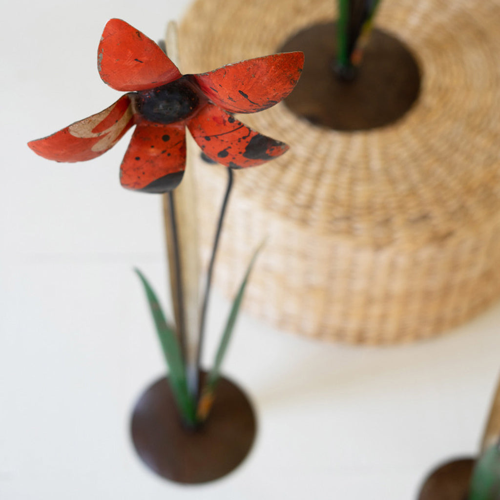 Try this trio of recycled iron flowers in a corner where nothing grows. These tall flowers have orangish red petals and green shoots. Place them in pots at different heights for a year round pop of color.
