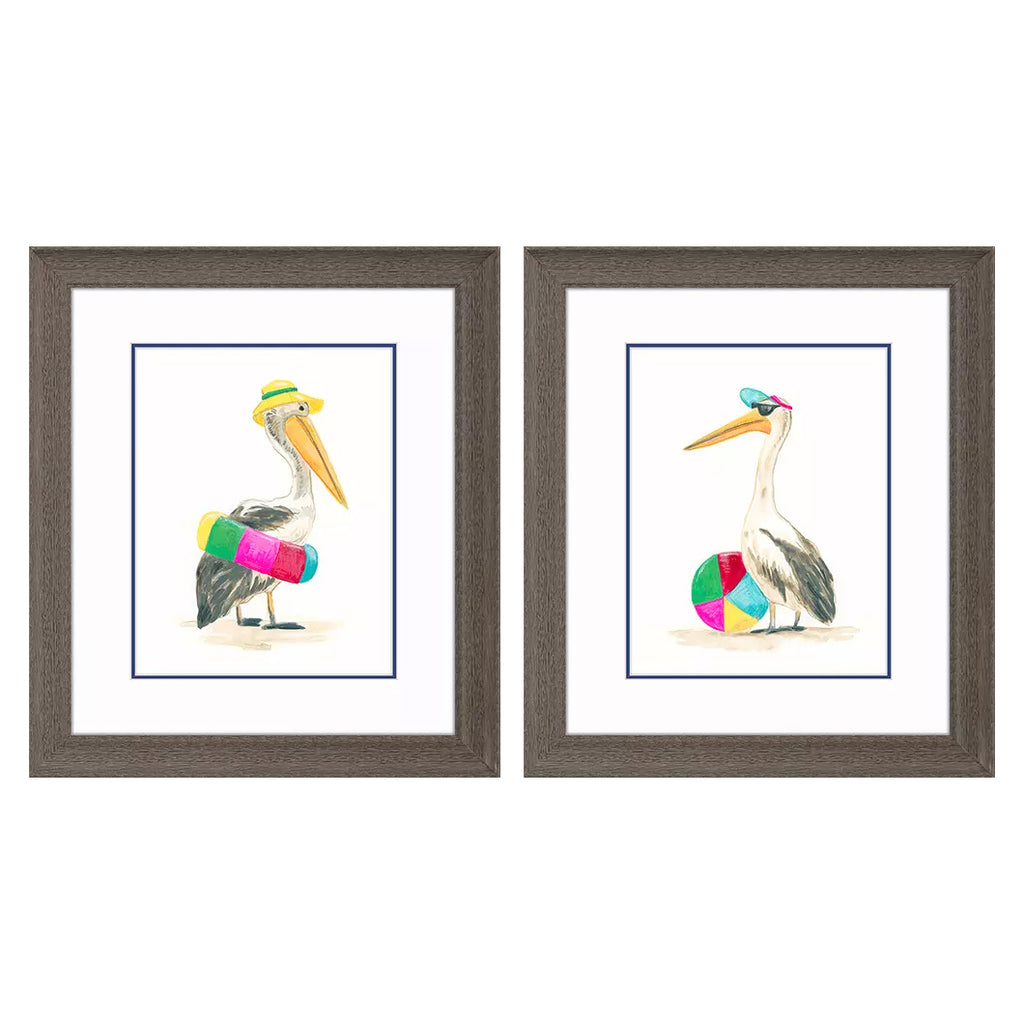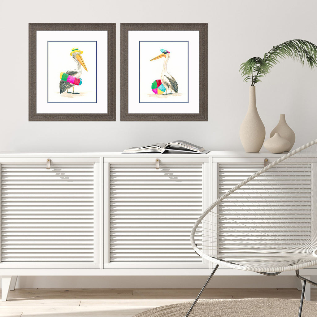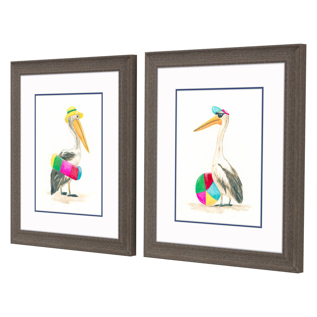 Hip birdies head to the beach. This colorful cast of characters is matted in white and framed in a rustic wood-grain finish moulding.