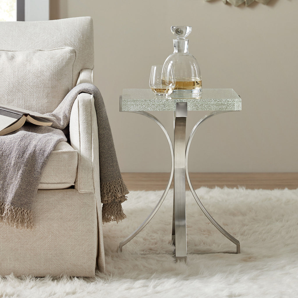 Infuse your space with a dash of bling and sparkle with the Bubble Glass Accent Table. Crafted with a chrome metal base and a bubble glass top, the artistic table has a contemporary chic that will add charm to any space.