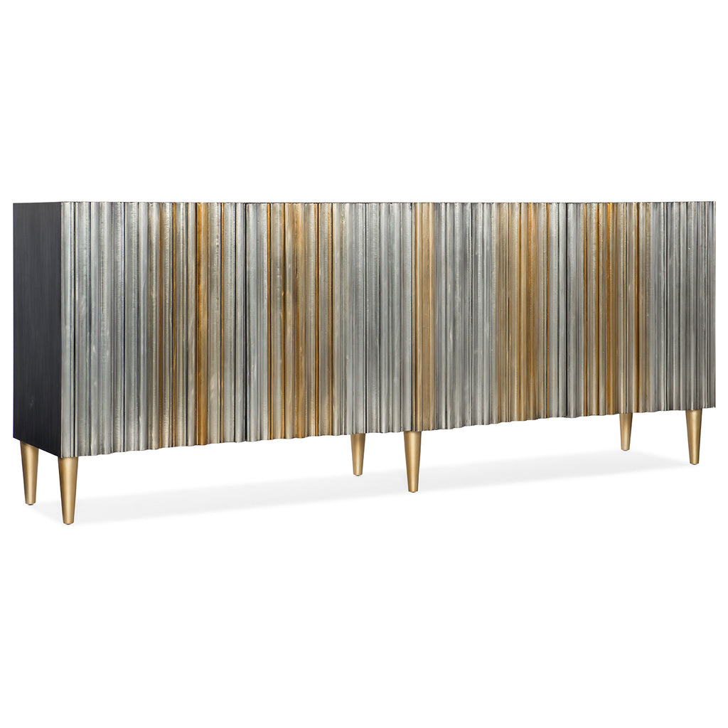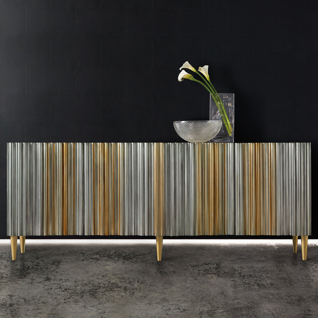 Mid-Century Modern gets an industrial luxe twist in the hardwood Apollo Credenza, with an exterior wrapped in aluminum sheet in silver and gold hues and accented by 6 shaped gold legs. Four doors have soft-close hinges and one adjustable wood shelf behind each set of doors. A ventilated back panel makes this piece media-ready.