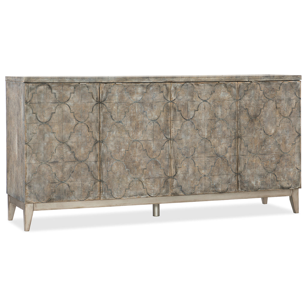 With a delicate and delightful grooved quatrefoil pattern on its doors, the Fairfax Credenza is crafted of Oak Veneers and Aluminum Sheet, accented with silver-colored zinc alloy tab pulls. The wood is in a distressed medium finish with hand planking. Four doors with one adjustable wood shelf behind each set of doors. Ventilated back panel.