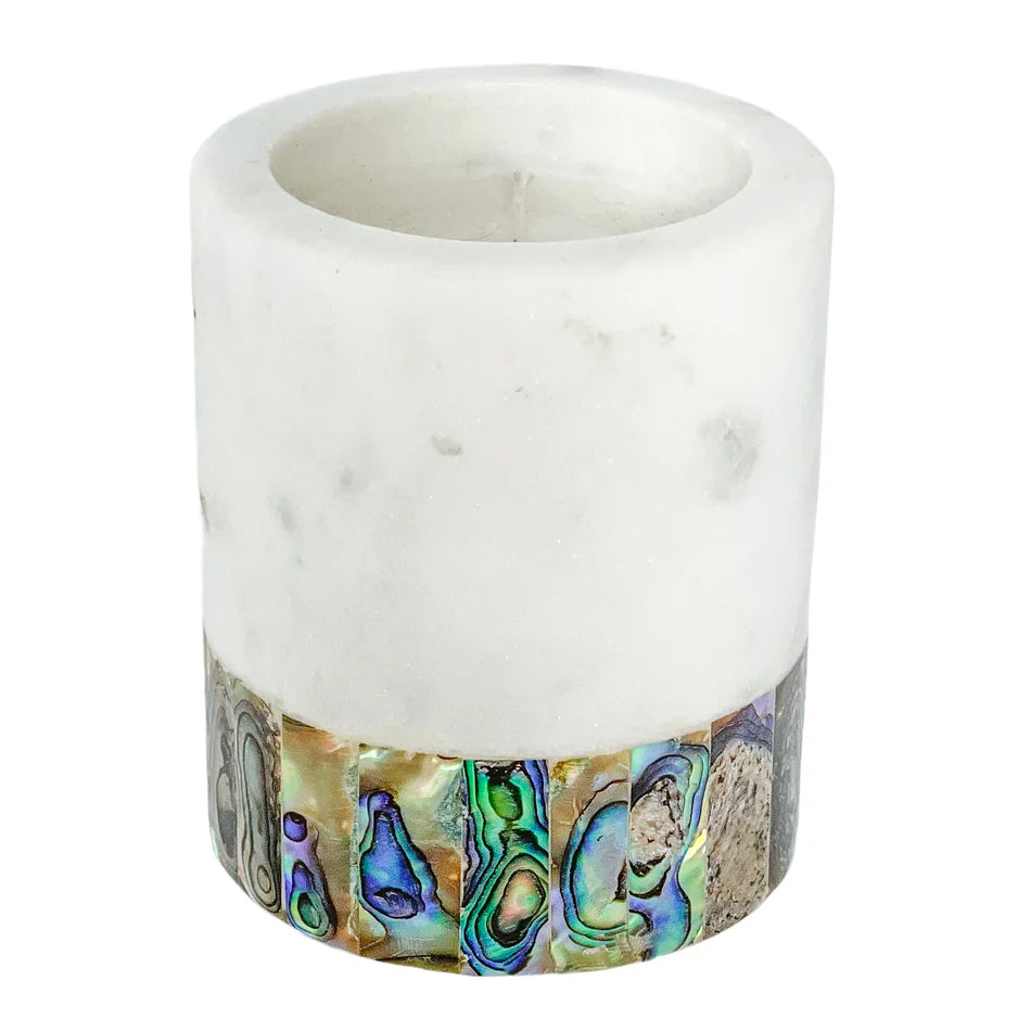 The Rainbow Mother of Pearl White Marble Candle is made with 100% Soy Wax. The Mother of Pearl is a natural Iridescent Grey color tone with hints of light golden accents.