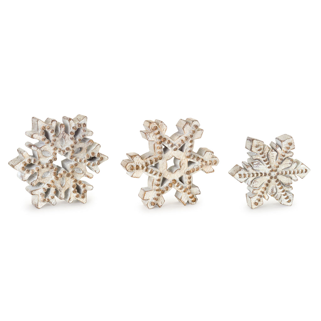 Add a rustic touch to holiday home decor with this set of snowflakes. Featuring three styles, the traditional snowflake design paired with the whitewash color makes this piece the perfect addition to your winter decor. The quality polyresin composition is sure to last for seasons to come. Display the pieces in a table centerpiece or mantle arrangement to add interest.