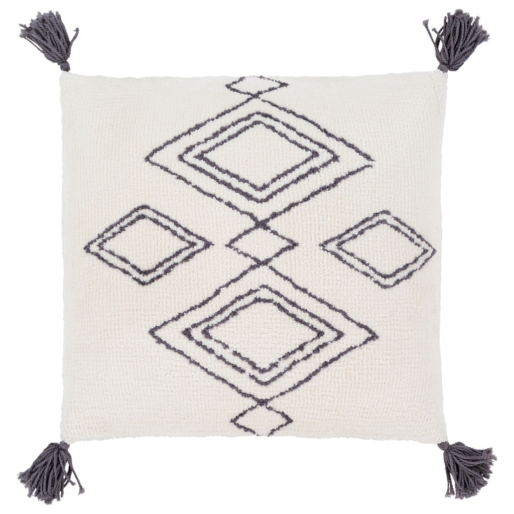This bohemian pillow from the Brett collection is a gorgeous hand woven décor piece. Knitted with water resistant acrylic on the front and cotton on the backside. This pillow also features interesting tassels on its corners.