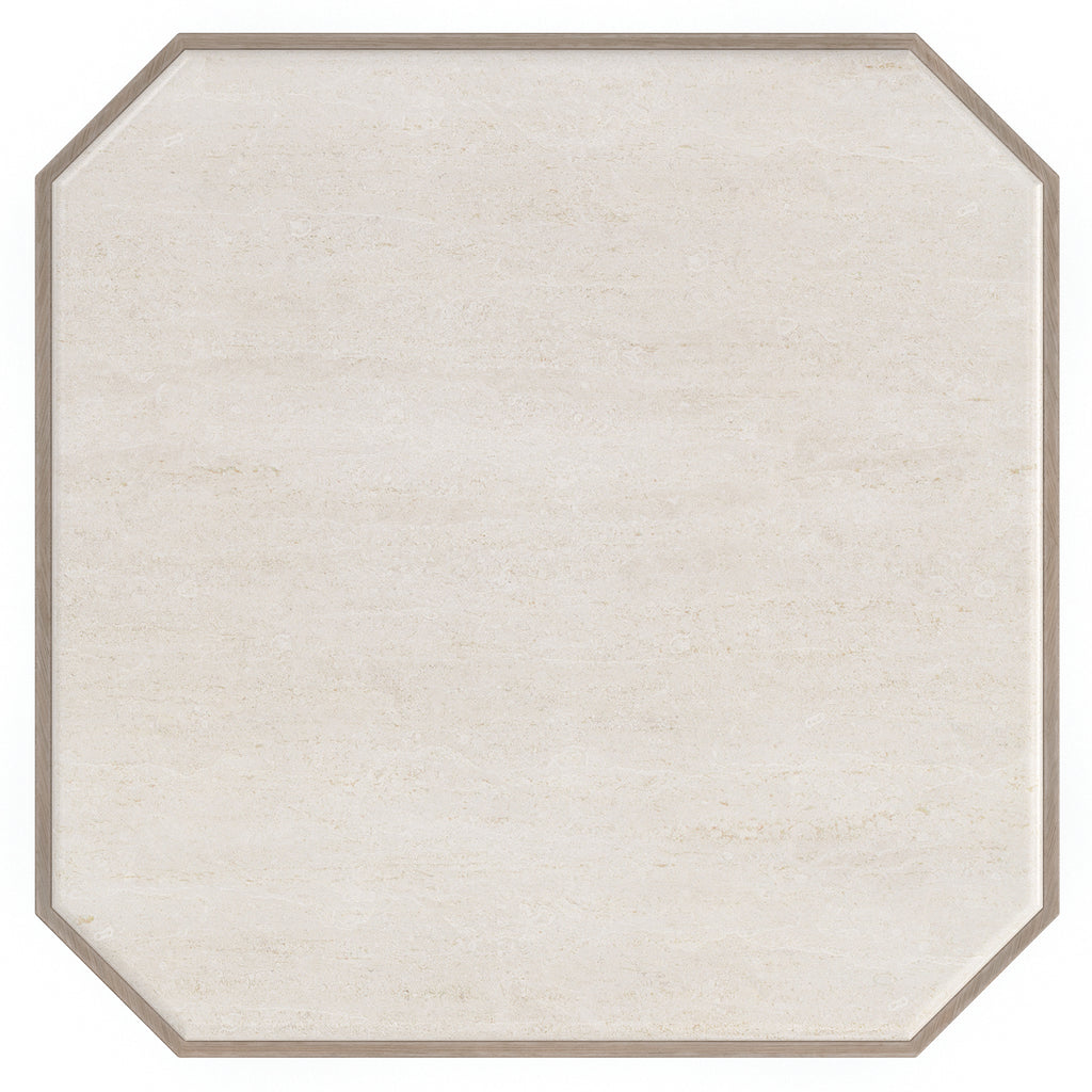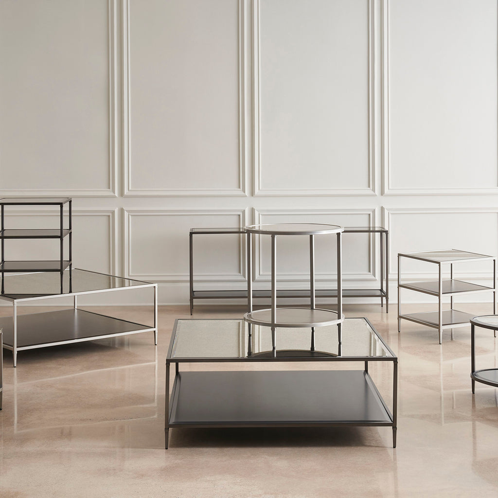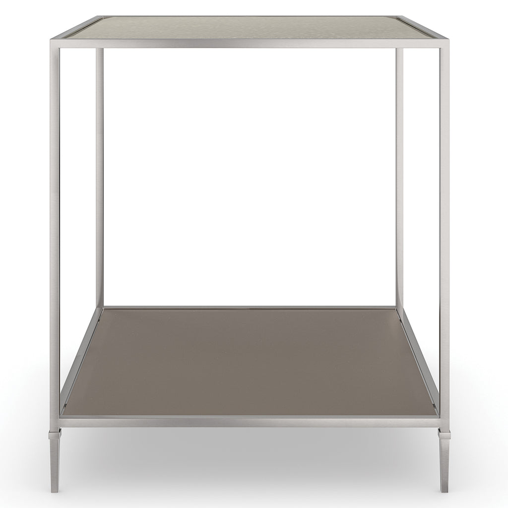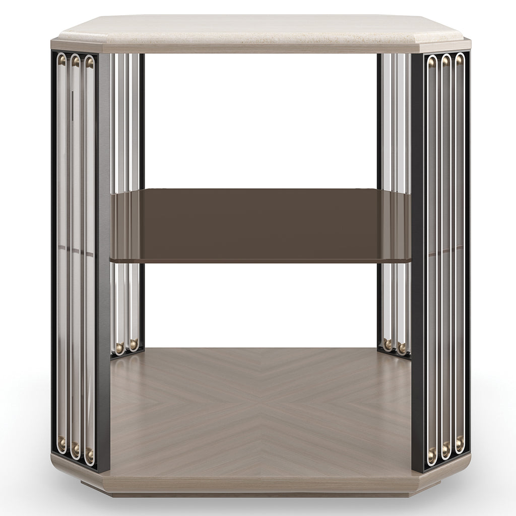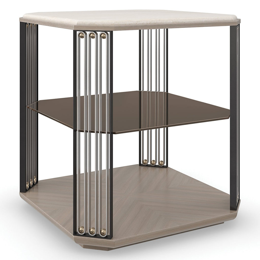 A seemingly floating glass shelf in a smoky bronze finish adds to the allure of this end table, inspired by the bent metal work of notable French designer Jean Prouvé. Features ornamental legs, meticulously crafted in a fusion of Deep Bronze, Brushed Gold, and Brushed Stainless metals, topped by Crème Travertine stone. Substantial in form, yet airy and reflective, it offers ample open space for displaying art books and objects.