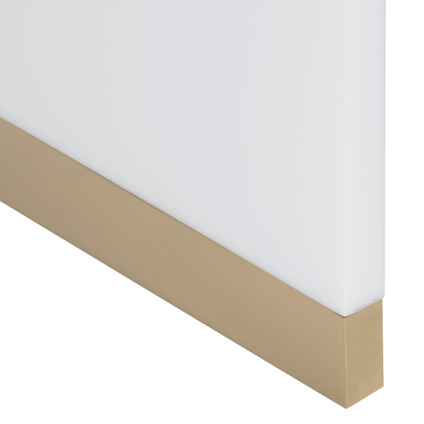 White acrylic end table with waterfall edge and polished brass feet. Designed by Bill Cain.