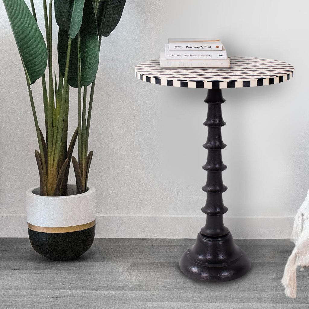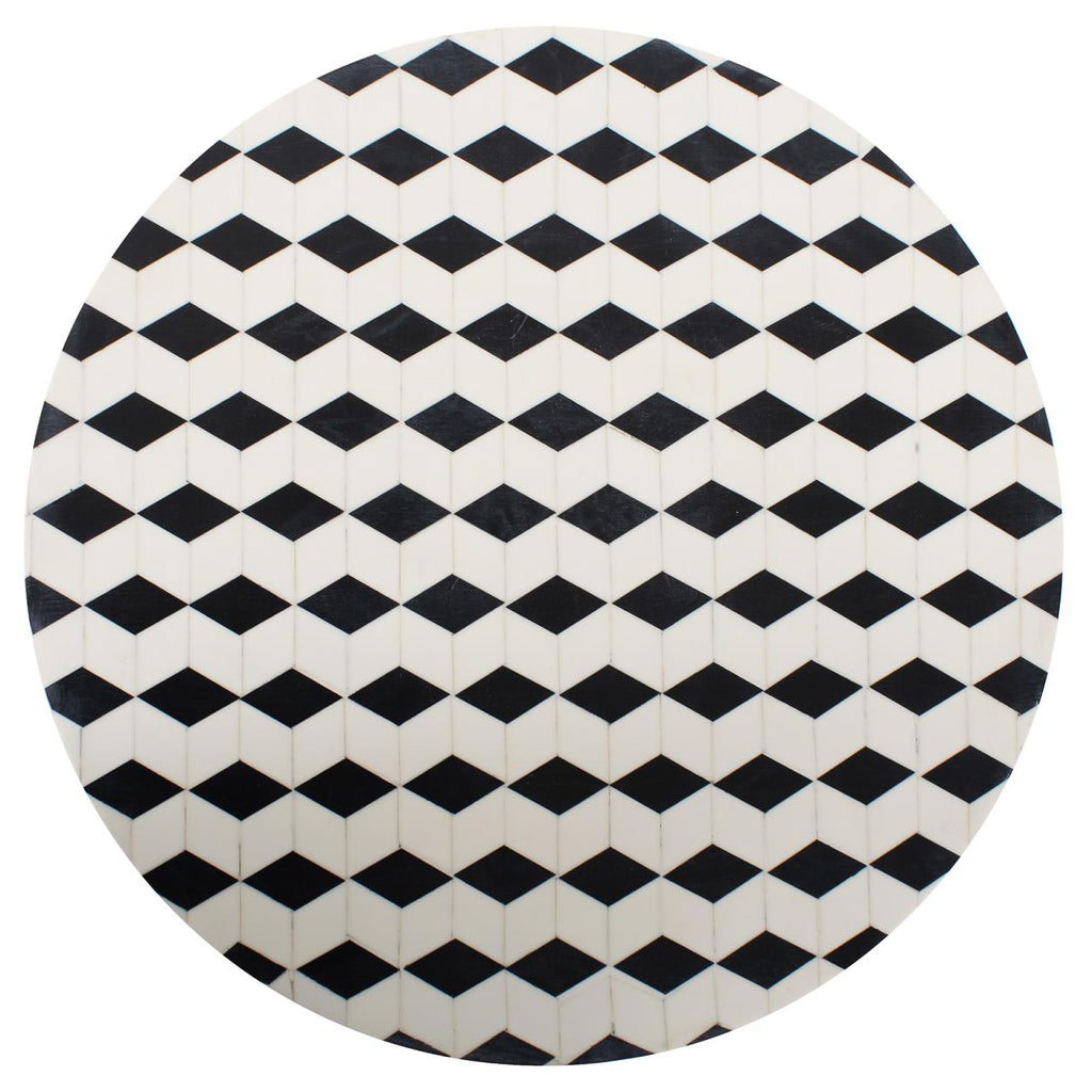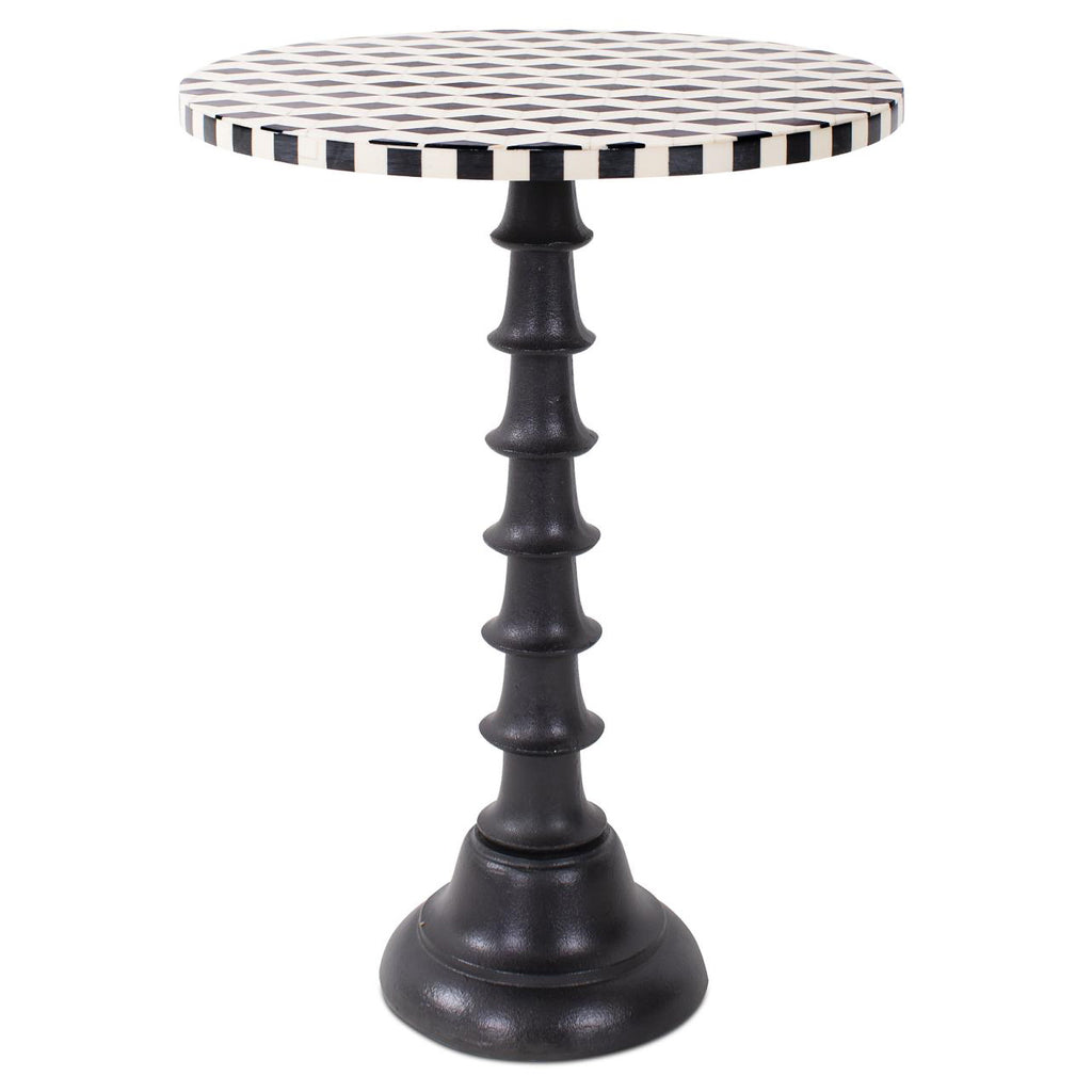 This beautiful inlaid diamond patterned drink table originated from vintage Italian harlequin patterned marble floors. The Columbina drink table features a very durable and heavy cast iron aluminum base finished in matte black to compliment the black and white design of the top. A great accent table in a small niche within your kitchen or as a small lamp table next to your favorite lounge chair.
