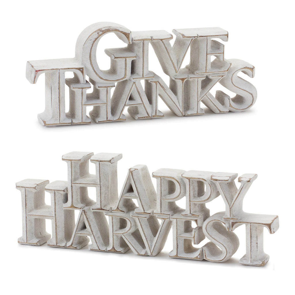 Welcome your guests this fall season with a stunning set of Tabletop Fall Sentiment Signs! Featuring a quality polyresin construction and white-washed wood design, the traditional "Give Thanks" and "Happy Harvest" sentiments are sure to bring smiles to your guests' faces. Display the pieces together to make a statement, or display them alongside other decor to add festive cheer to the space. Make this year's autumn decor extra special with the beautiful Metel Tabletop Fall Sentiment Signs!