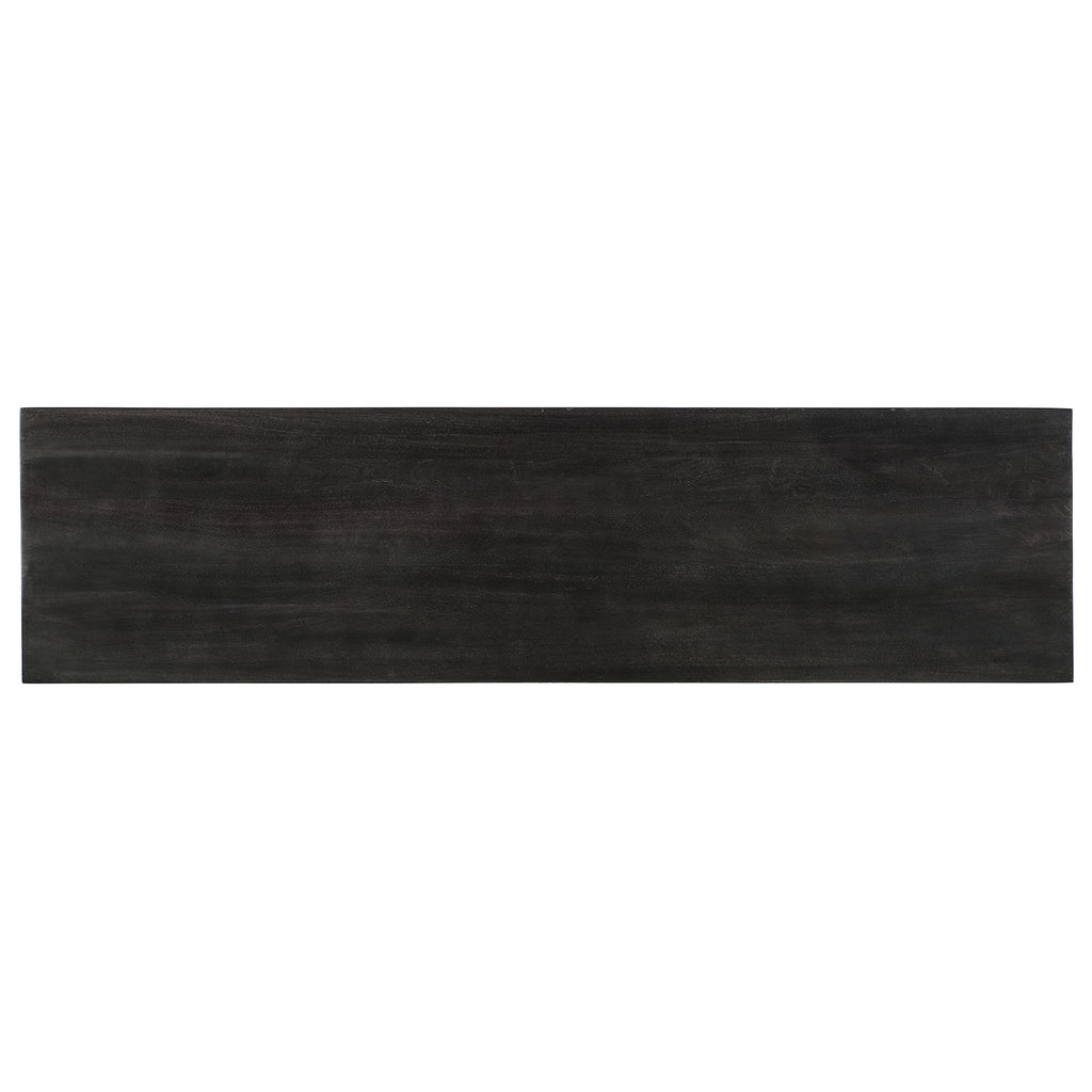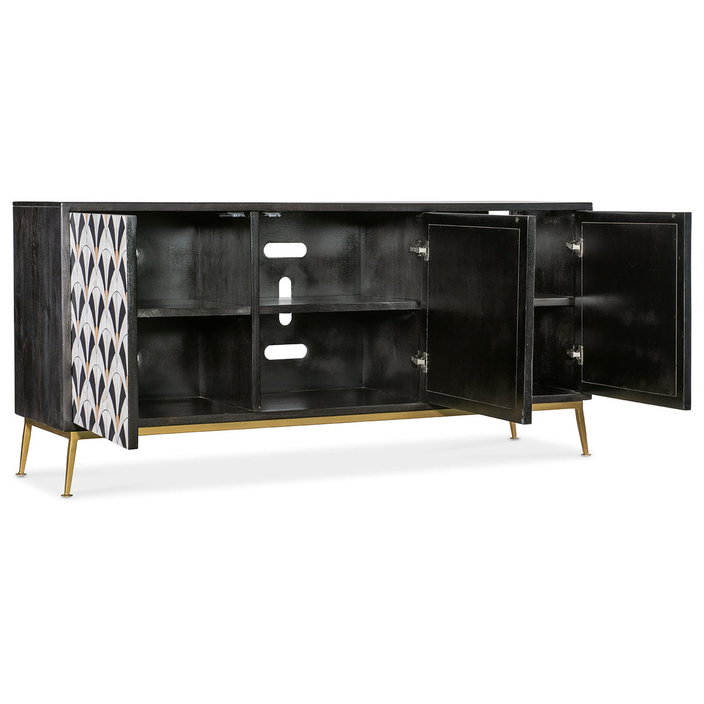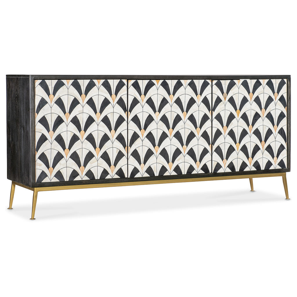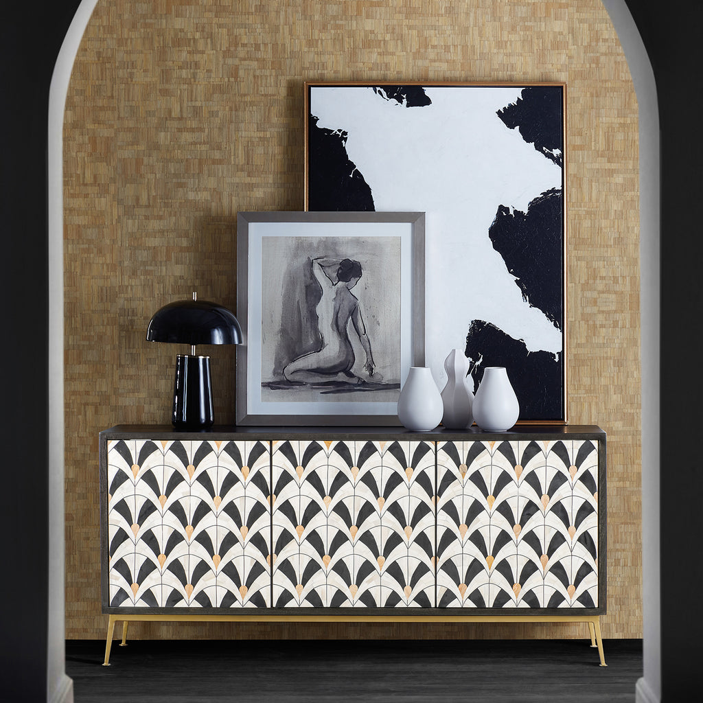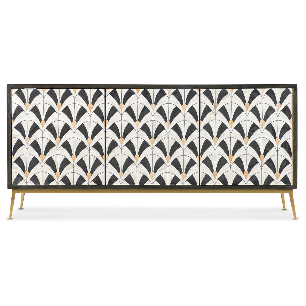 The striking staccato style of the Renee Credenza is expressed with a black wood finish accented by beige, brown and bone inlay on the door fronts. Crafted of Mango Wood, the credenza has 3 doors with touch latches, one fixed shelf behind each door and wire management holes in the back. A gold metal base and legs complete the eclectic design.
