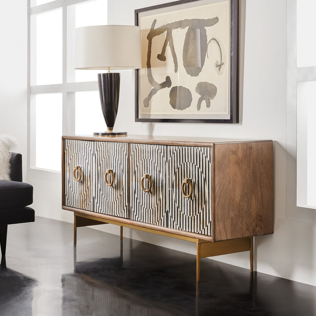 In a study of juxtapositions, the media-ready Russell Credenza combines linear and circular forms and a mix of materials including mango wood, bone inlay and brushed gold metal ring pulls and a gold metal base to create a striking contrast that is sure to take center stage in any space. Offering a ventilated back panel, the credenza accommodates up to a 65-inch TV. Four doors with bone inlay and soft-close hinges with one adjustable/removable shelf behind each pair of doors.