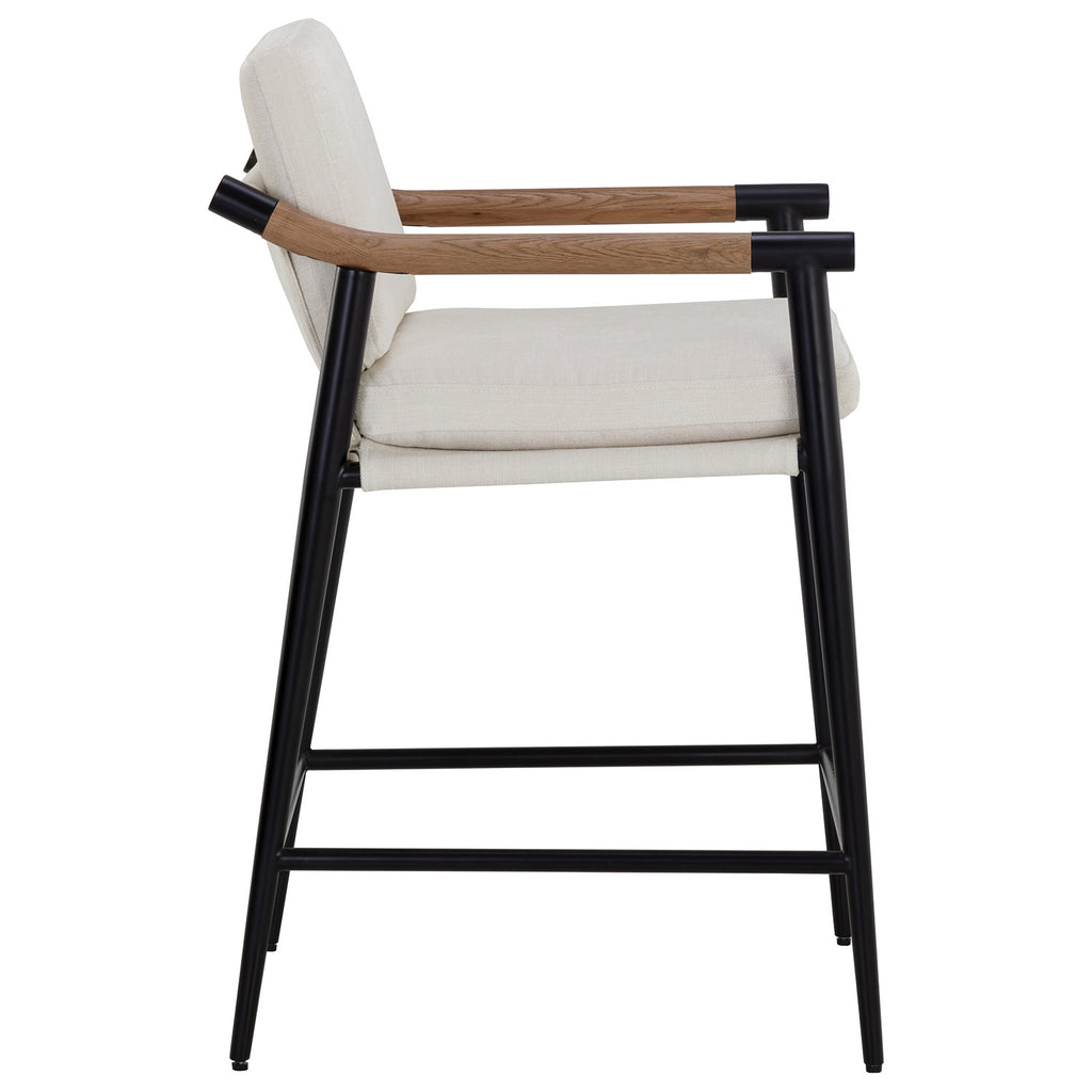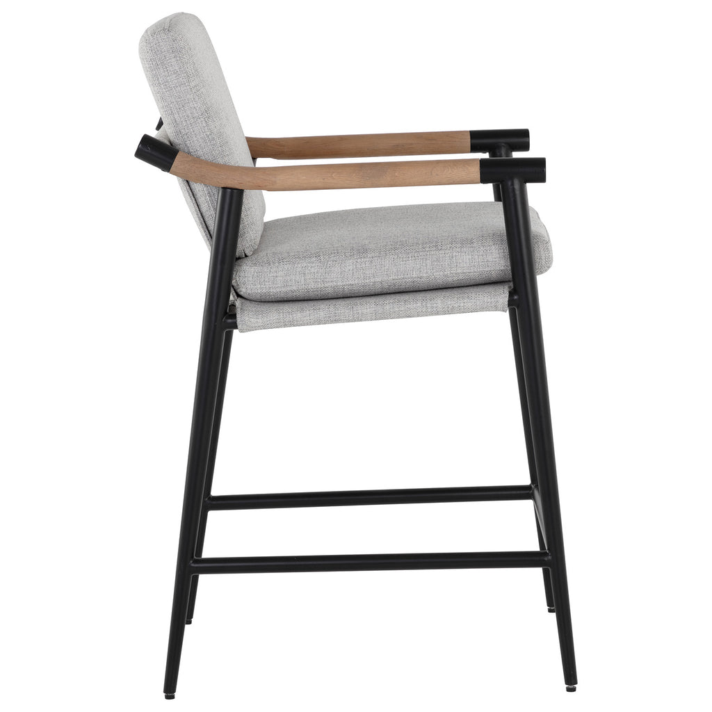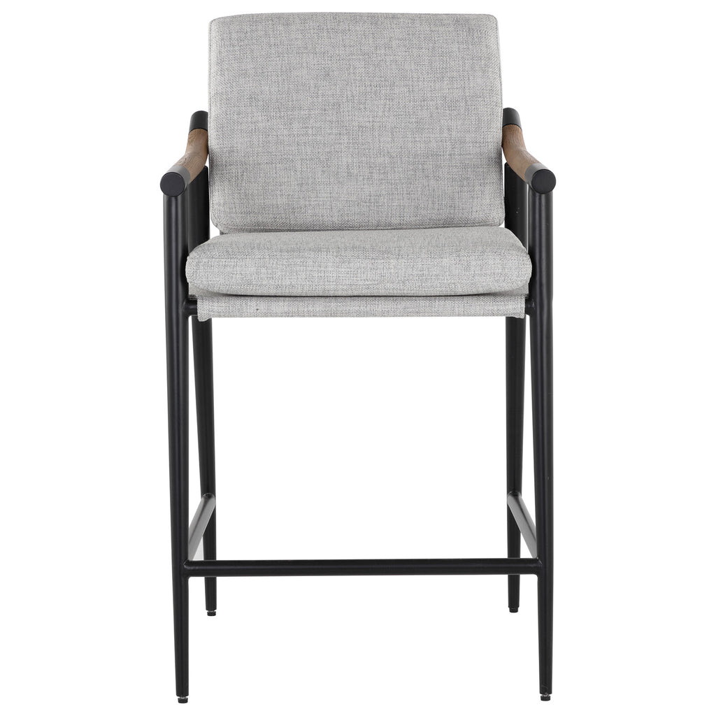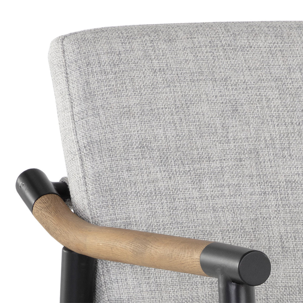 Functional with a timeless design, this mid-century style counter stool offers a clean silhouette that will suit any space. Stocked in vault fog or Heather Ivory Tweed fabric with solid oak wood armrests. Completed with a black iron frame.
