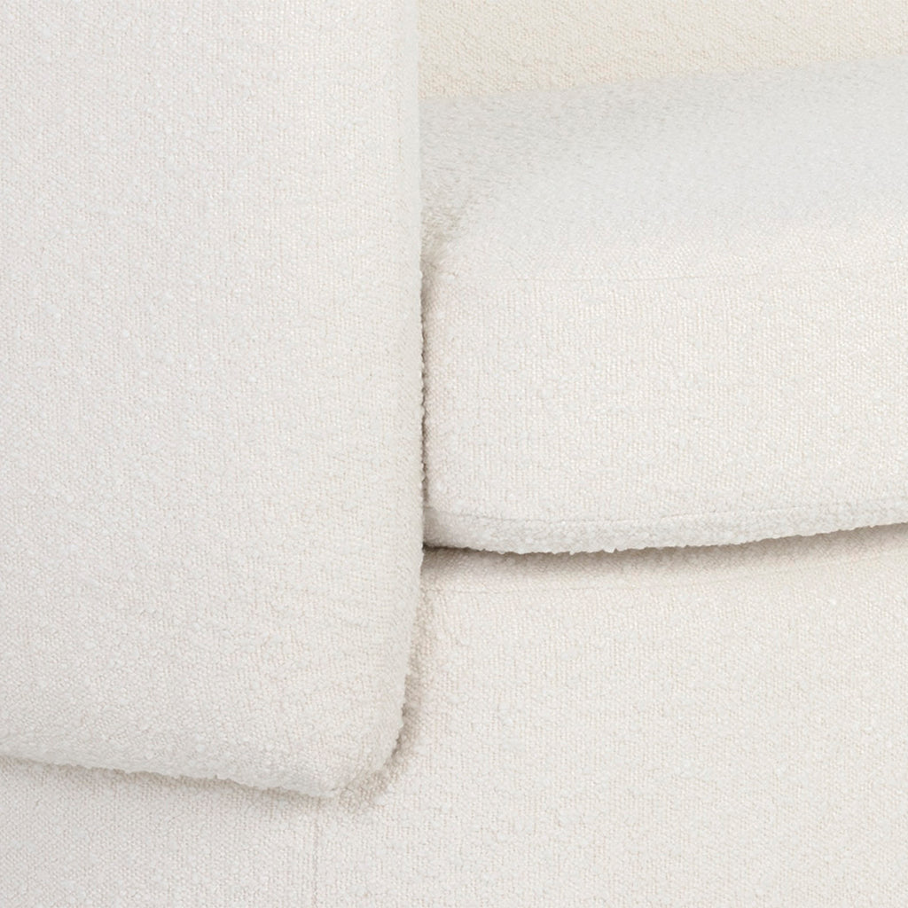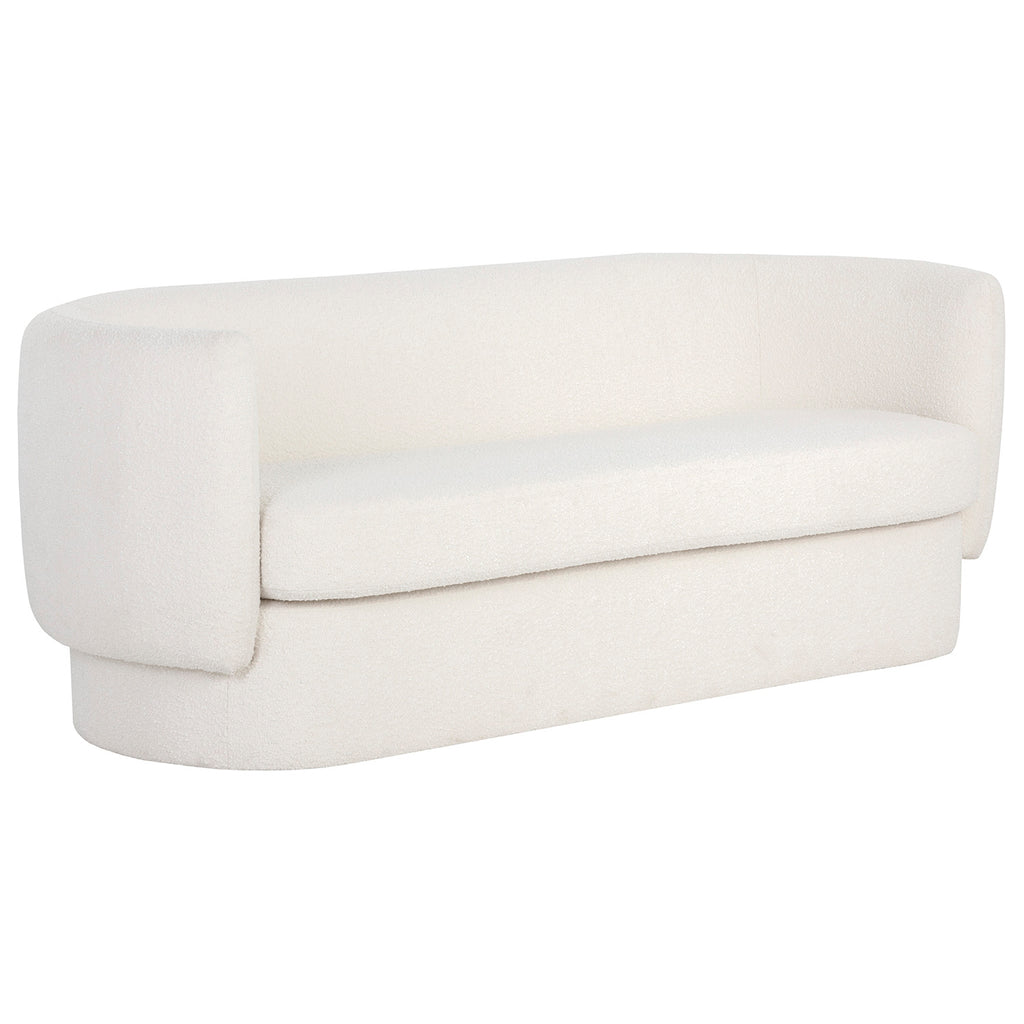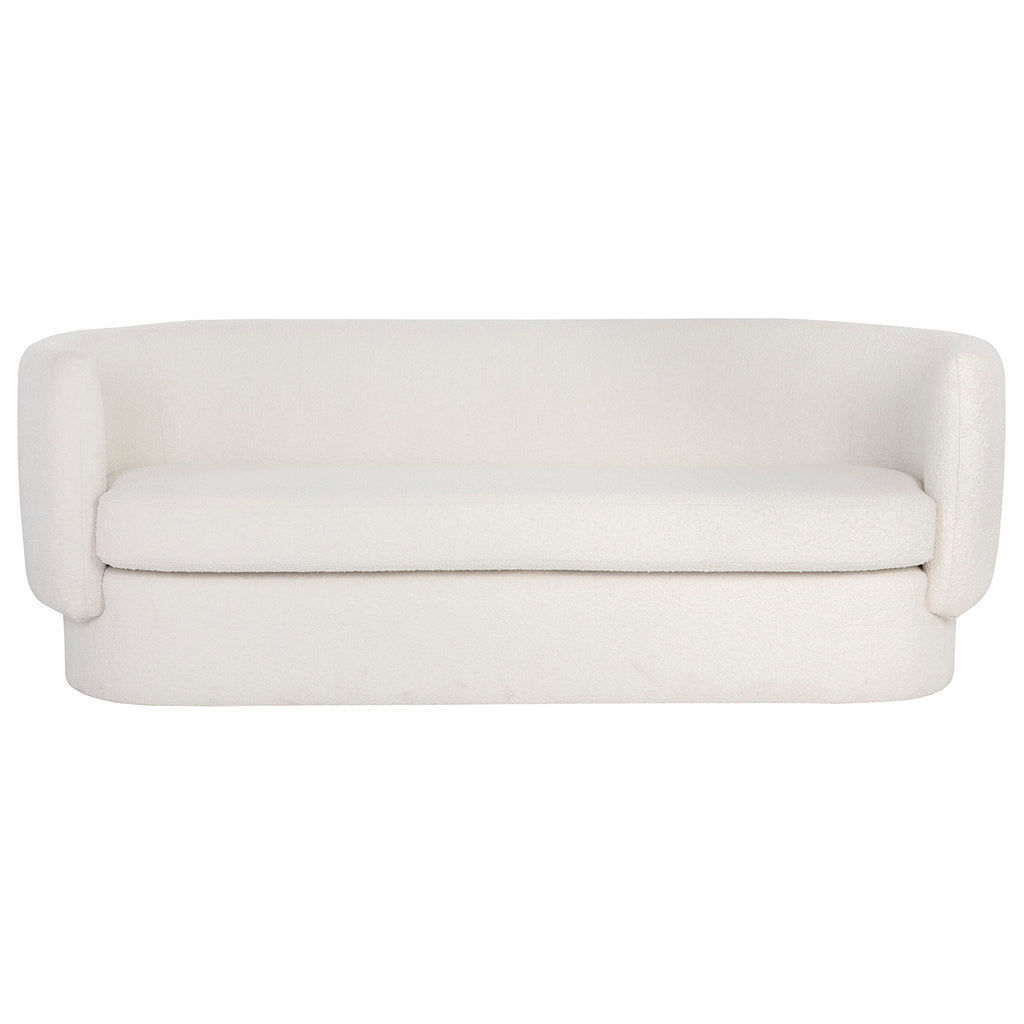 Evoke a stylish flair with this curved, contemporary sofa. Features a capsule shaped frame in maya white fabric. Maya fabric features a boucle texture. Eye-catching from all angles. Coordinating armchair also available.