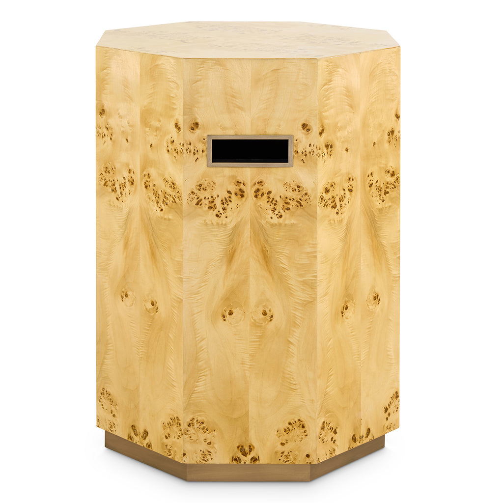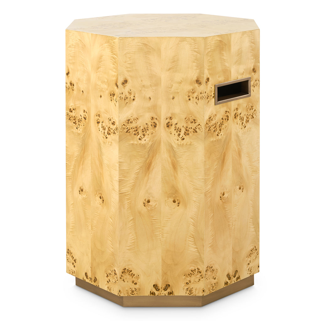 The Octavia Side Table fits anywhere in your home with beauty and versatility. Our designers shaped this piece to highlight simplicity: its sharp, geometric lines and custom-made brass accents offer a modern touch, while the option of either a lacquered linen or burlwood veneer finish add the element of luxury. With a variety of colors and finishes to choose from, and its petite size, the Octavia can adapt to every room. Set this refined tabletop in between two chairs or by your bed to put this stunning work of craftsmanship on display.