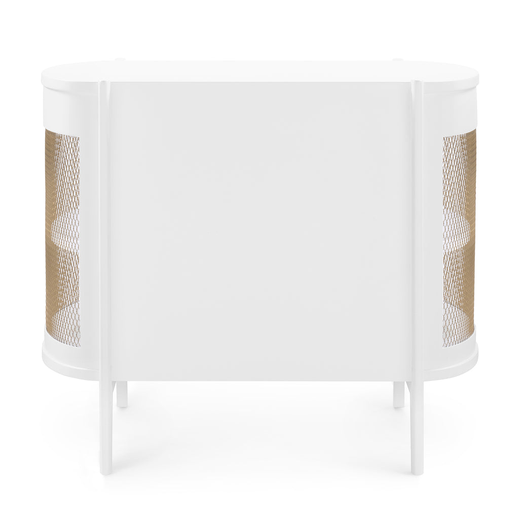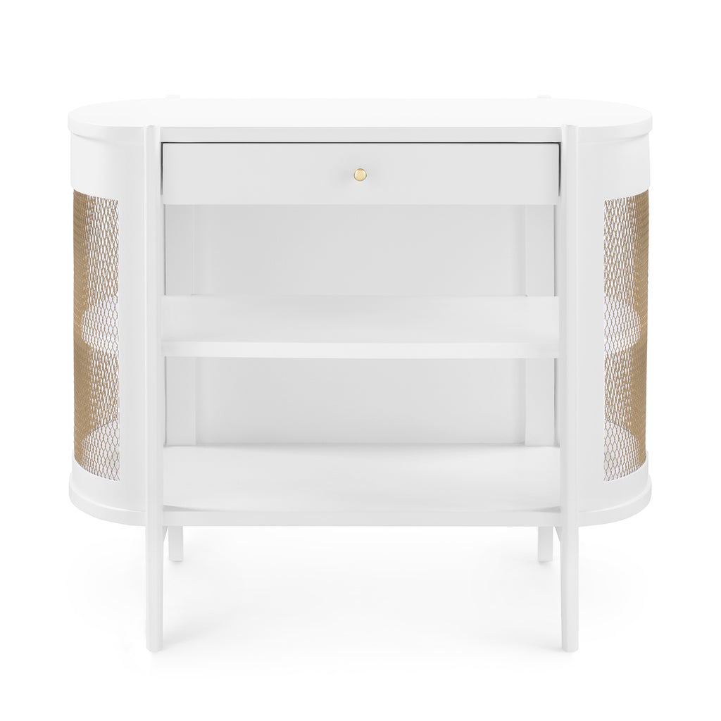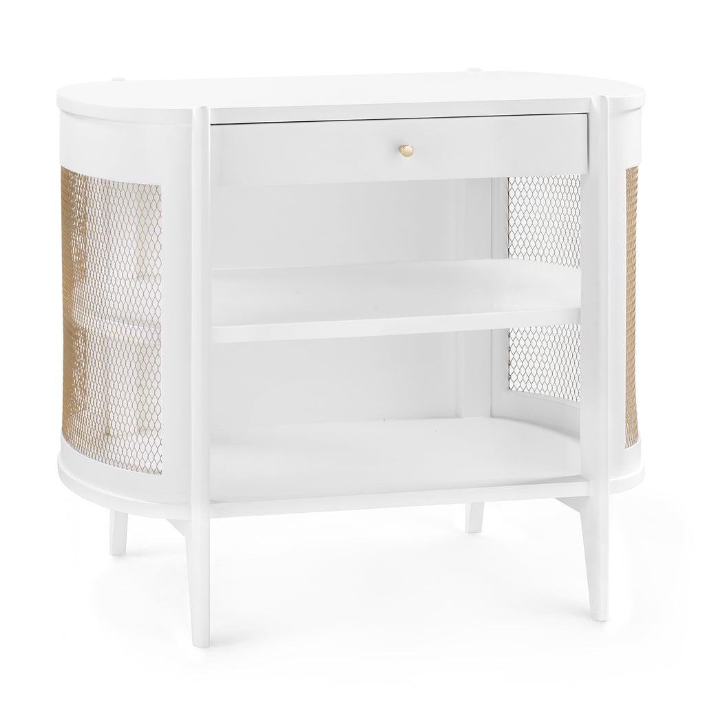 With a sense of luxury influenced by French design, the Nadia 1-Drawer Side Table feels almost as if it were plucked from a Gilded Age drawing room. It emanates vintage glamour through modern construction, with elegantly rounded edges and a shining display of gold mesh on its side panels. Two interior shelves provide generous storage, while the transparent nature of the gilded mesh allows for the effortless display of what’s inside. Thoughtful details, from gently angled feet to polished brass pulls, add to the Nadia’s overall look of refinement and hint at the quality of craftsmanship. Finished in clean white lacquer, the side table is a standout for your next bedroom, living room, study or formal entry design.