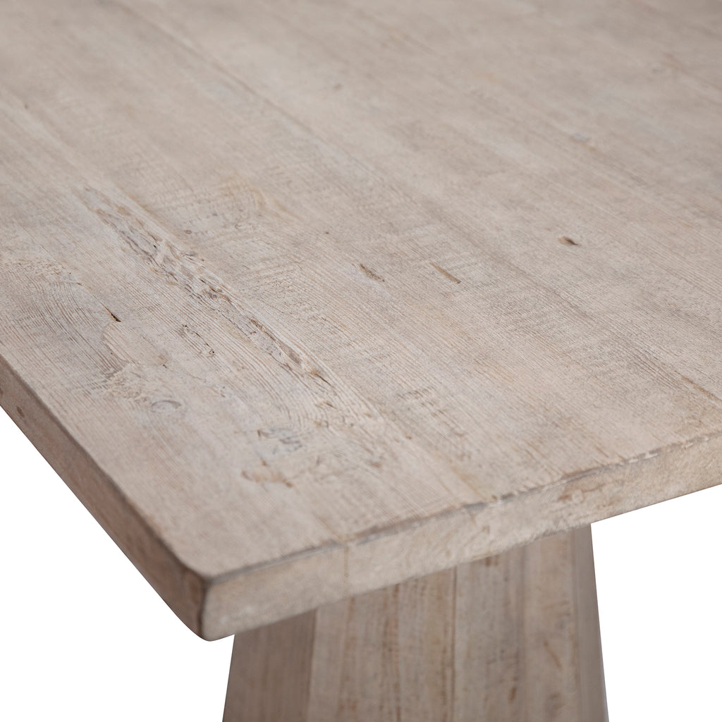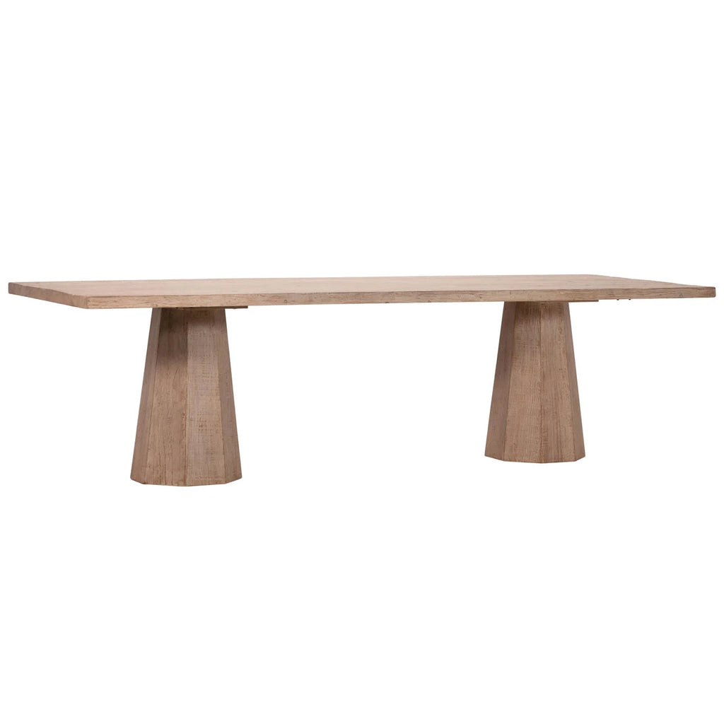 The beautifully curved reclaimed pine wood top of this dining table perfectly harmonizes with the hexagonal shape of its wood base. The light warm washed finish works great for any style or décor. Creating the perfect stage for an enjoyable dinner gathering.