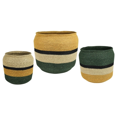 This set of 3 earth-hued seagrass woven baskets are stitched with cotton to offer understated shapes and sizes designs to add style and function to the home. Organize clutter, shoes or toys with an artisan aesthetic.