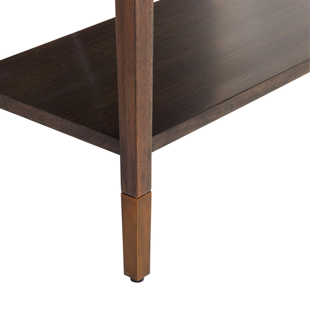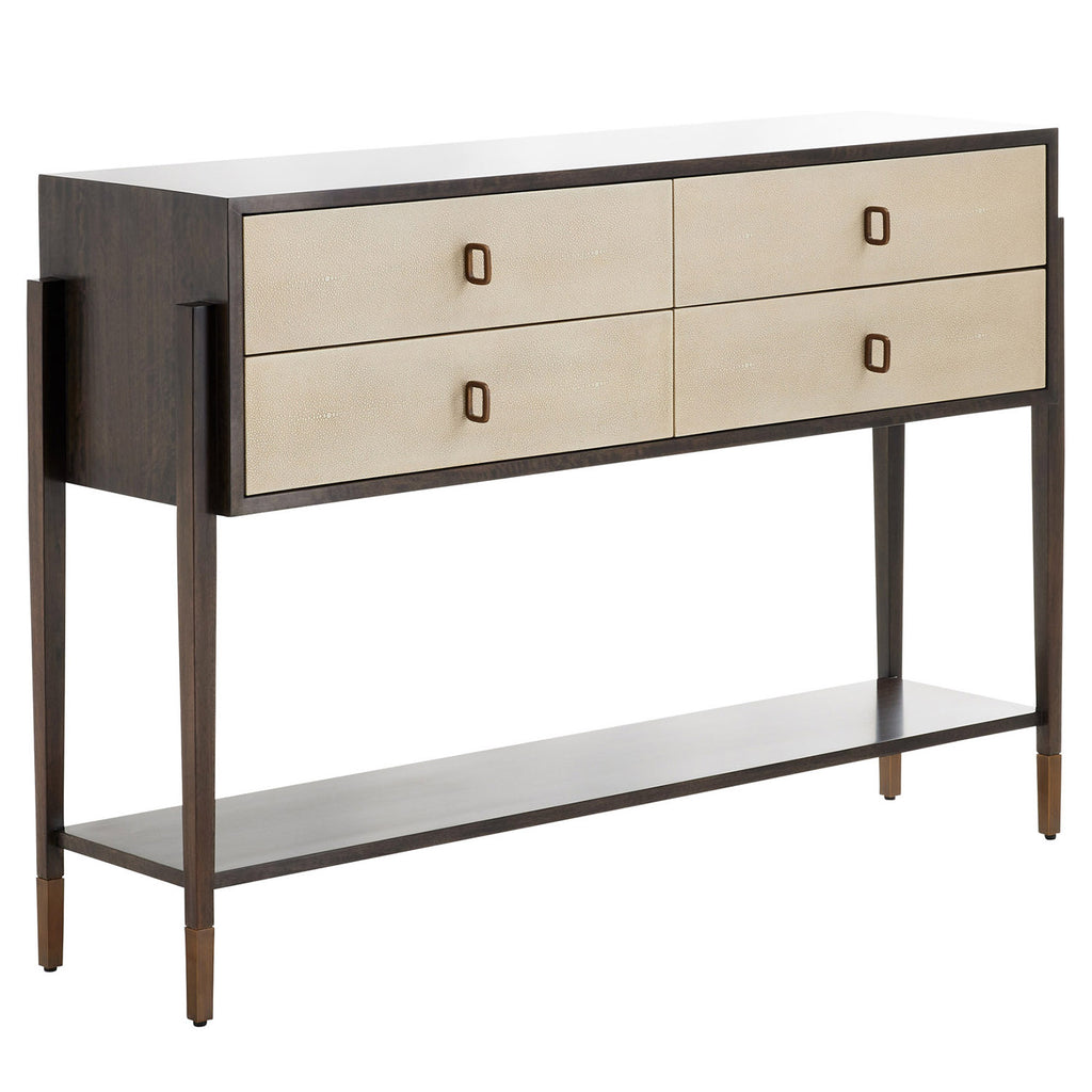 This console showcases a brindle eucalyptus veneer contrasted by ivory embossed leather façade with ring hardware and levitated-leg design; includes four soft-close drawers. Finish will vary.