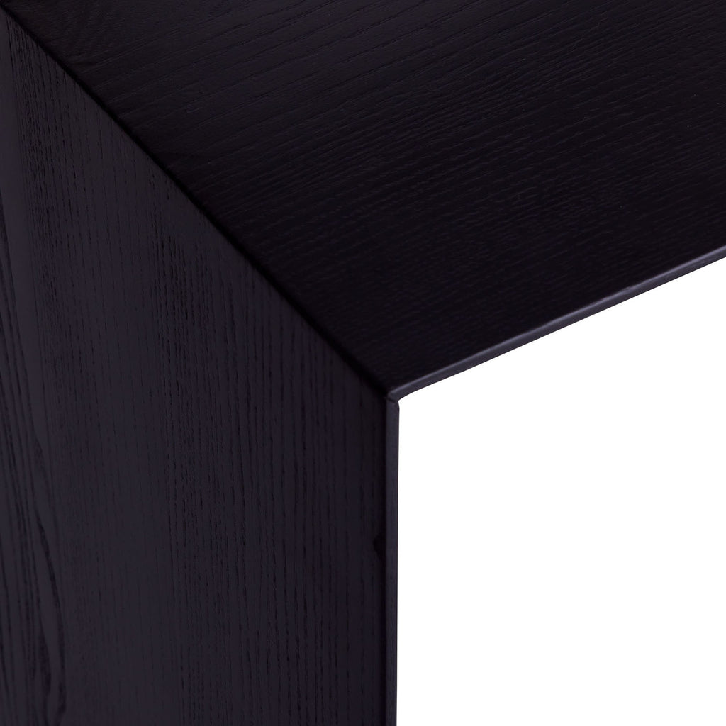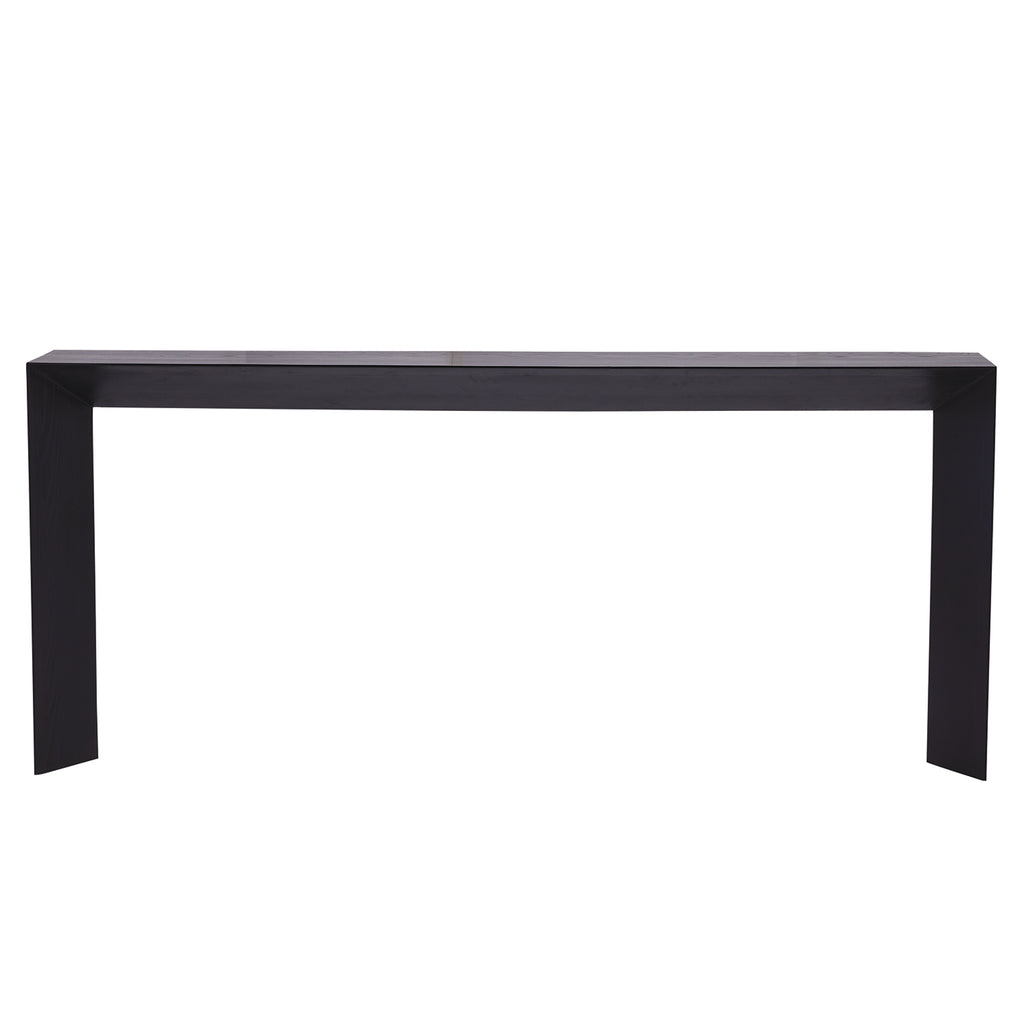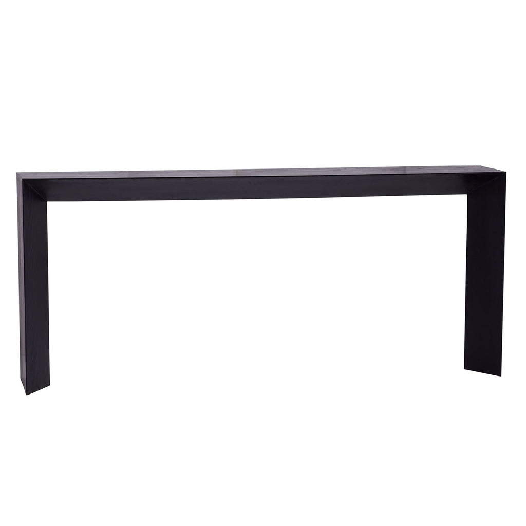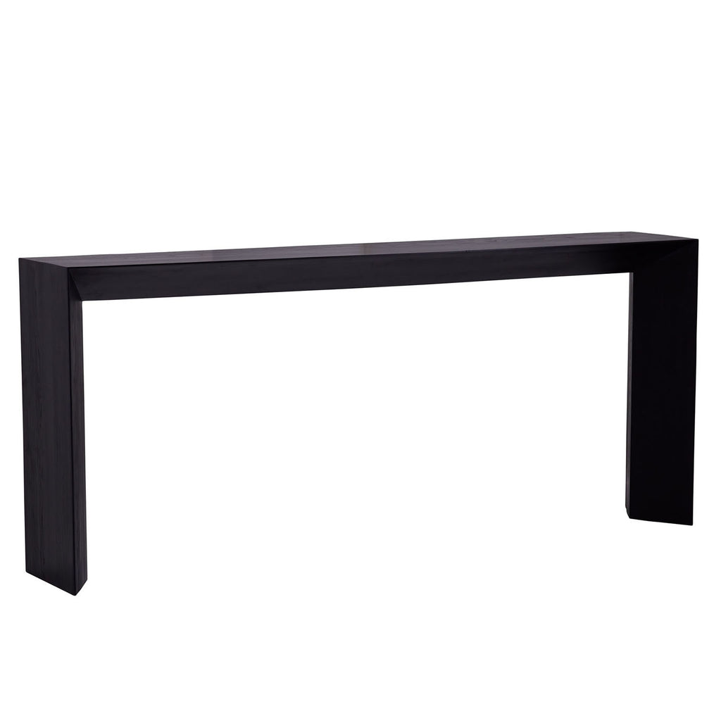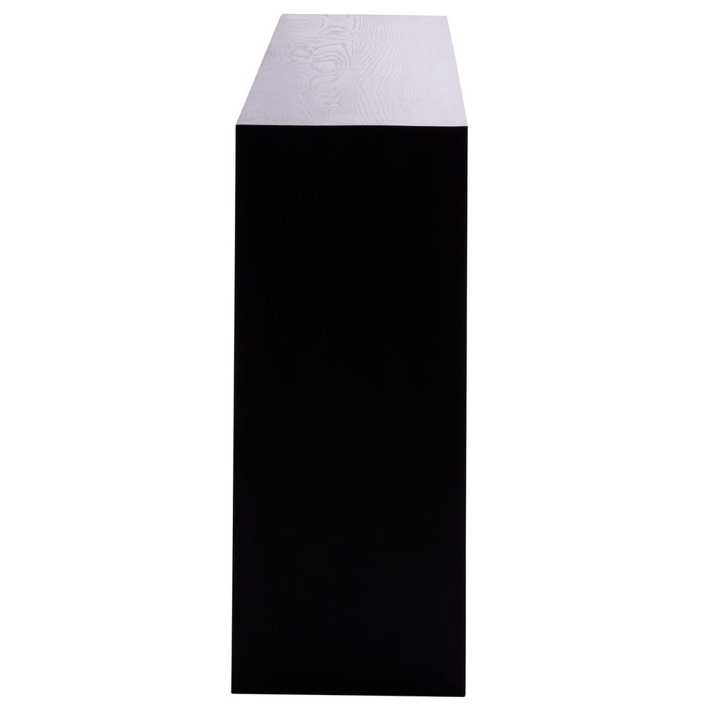 Rustic and modern, the Ormando console makes a bold statement. Architectural and geometric, the ebony finish over wire-brushed oak brings a dramatic element to a space. The angular form reveals a design that tapers from the outside in. Finish will vary.