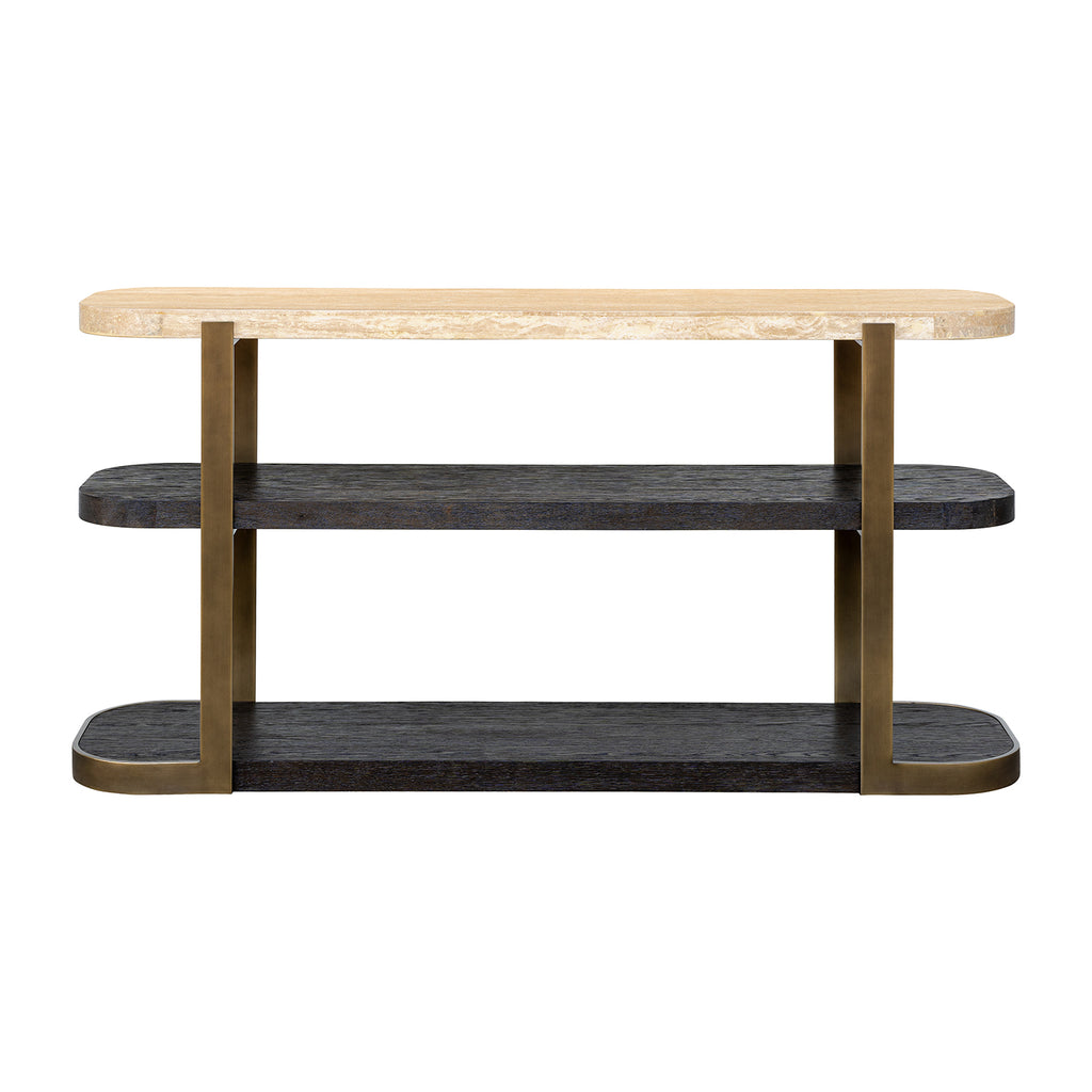 The Avalon Console Table seamlessly blends modern aesthetics with contemporary elegance. Its design harmoniously combines wood, stone, and metal elements, presenting a luxurious yet understated appeal. Crafted with a beige travertine stone top, a bronze-finished metal frame, and espresso oak-finished shelving, this piece exudes sophistication. As travertine is a porous natural stone, expect variations in veining and color, adding to its distinctive character. With its modern-luxe aesthetic and meticulous attention to detail, the Avalon console table is the epitome of refined taste, perfect for elevating any living space.