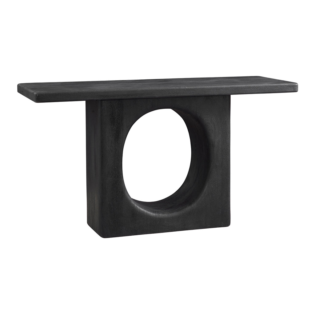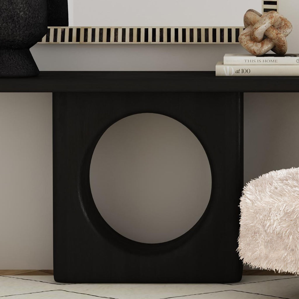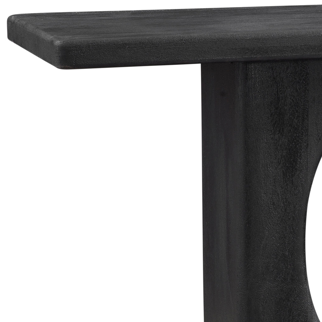 The Compass Console Table is a blend of rustic and modern design with a striking black finish. Crafted from sandblasted solid black mango wood, its substantial top and base offer a captivating presence. Mango wood boasts a naturally textured finish with a charming distressed effect.