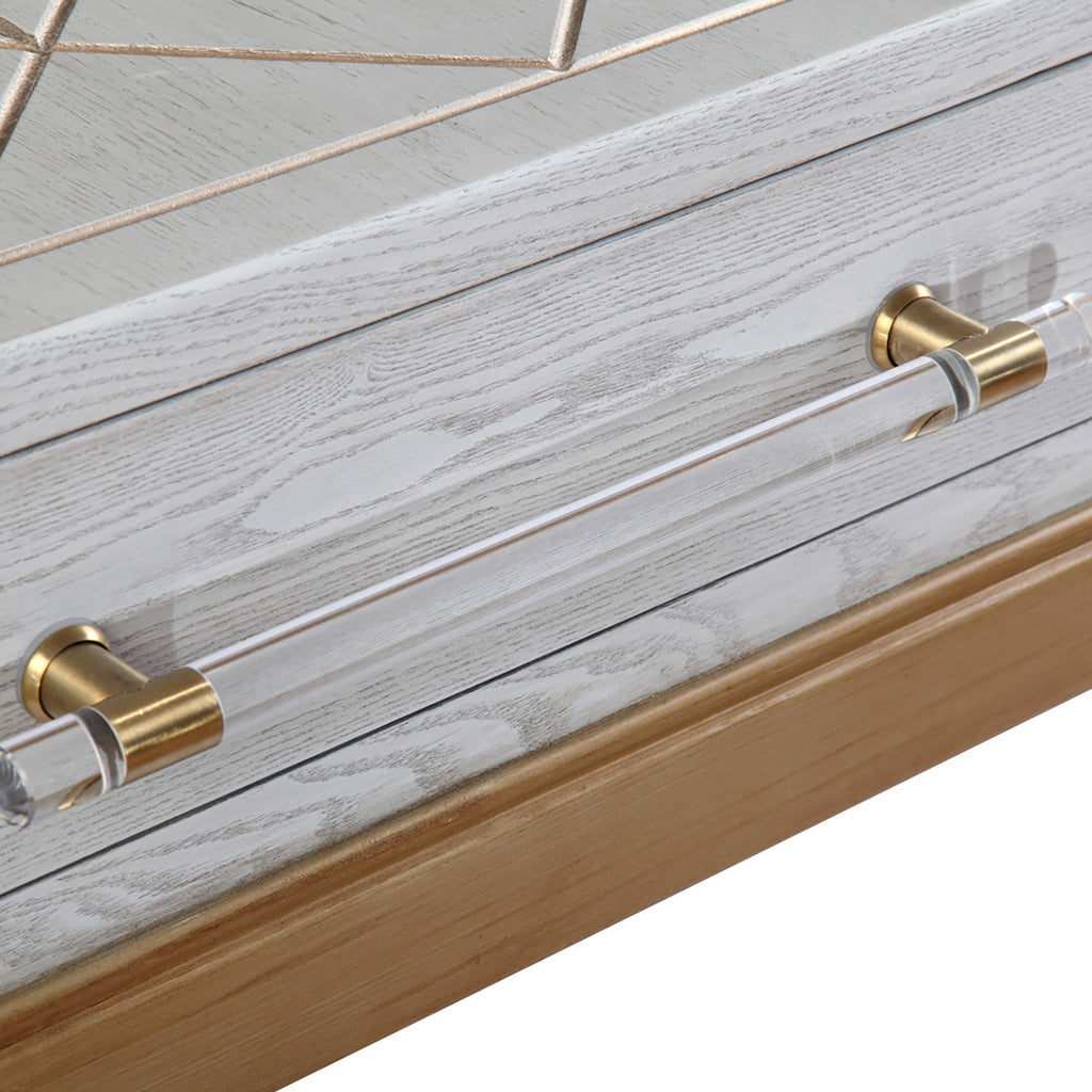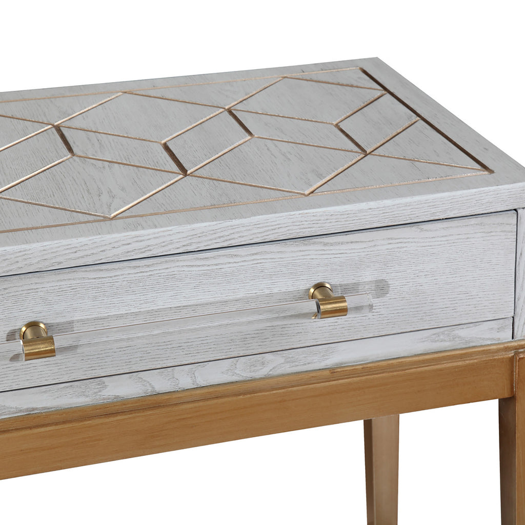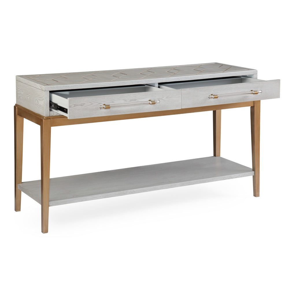 The Perrine Console Table will make the perfect addition for your home. The gold legs pop against the soft graphite gray table top. The top is accented with antique gold geometric inlay design, and custom acrylic hardware for the draw pulls. Includes two drawers and a lower shelf for maximum storage.