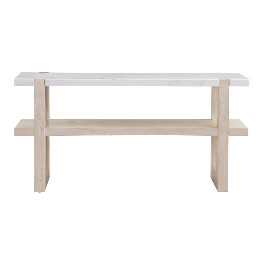 The Newport collection exudes Coastal Modernism, defined by the fresh, airy finish and white marble. Ash veneer in a sun-bleached finish is applied over thick, tapered legs that are exposed through the tops of the marble tabletops.