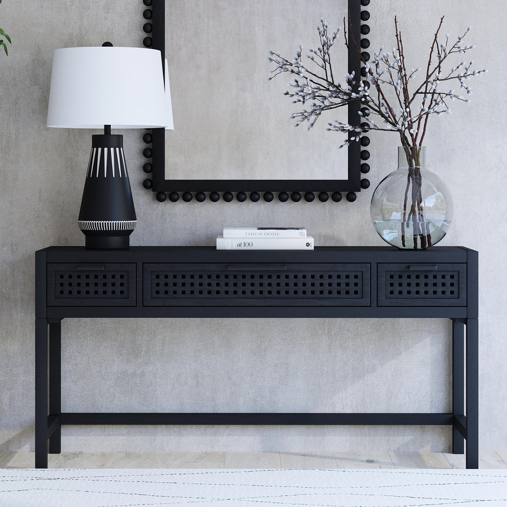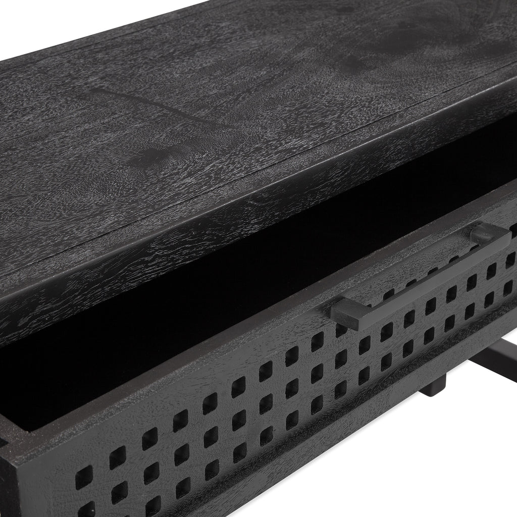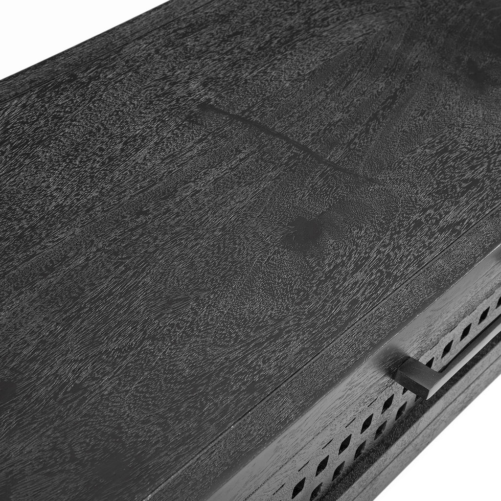 The Pentak Console Table features modern Bohemian styling with an industrial flair. Featuring three drawers highlighted with open-pierced fretwork detailing and matte black iron bar pull hardware. This console table is constructed with mango solids a finished in a sand blasted, matte black. Natural mango wood is a product of nature and is completely unique. The natural material is subject to variations in characteristics such as color, density, grain and finishing.