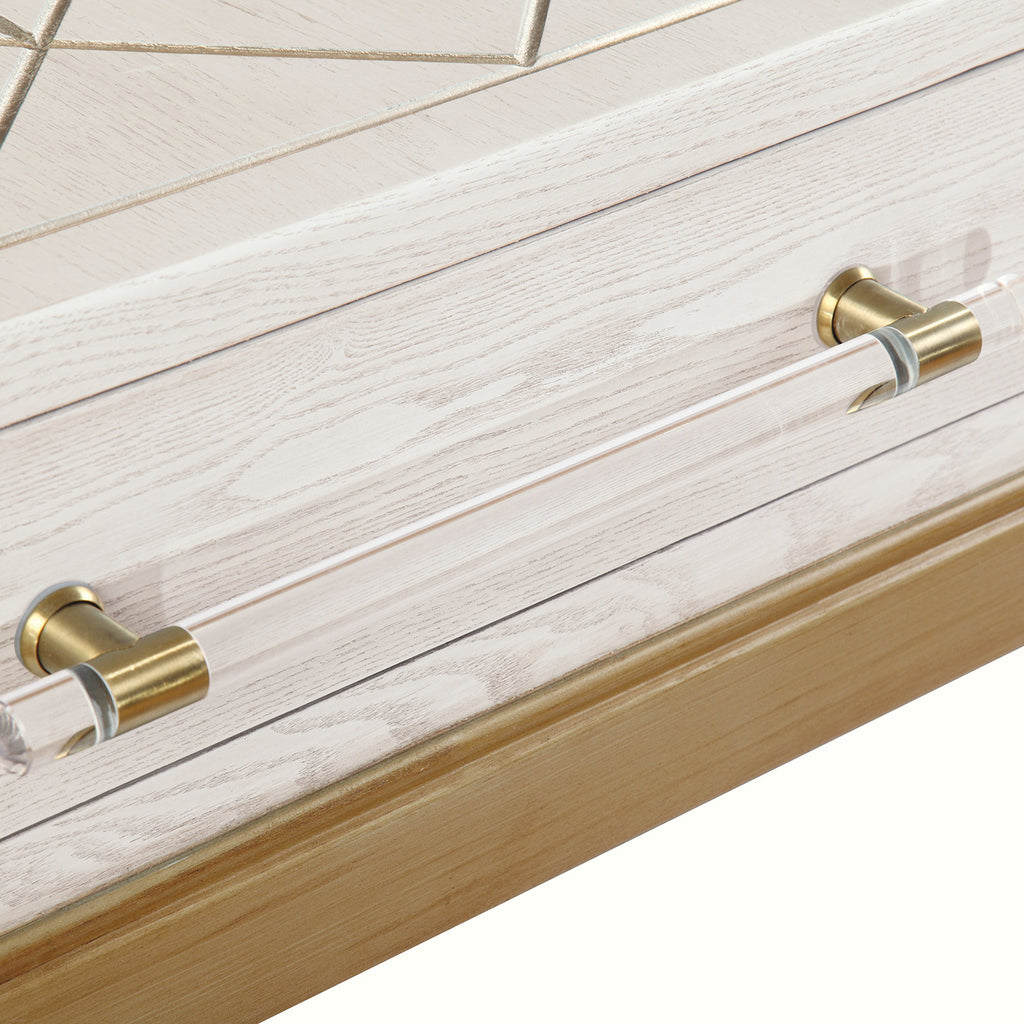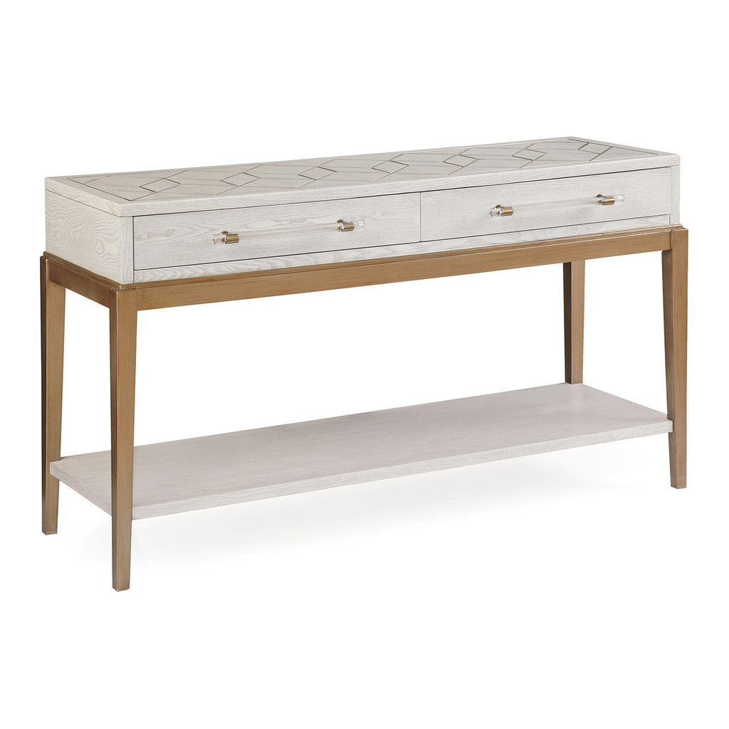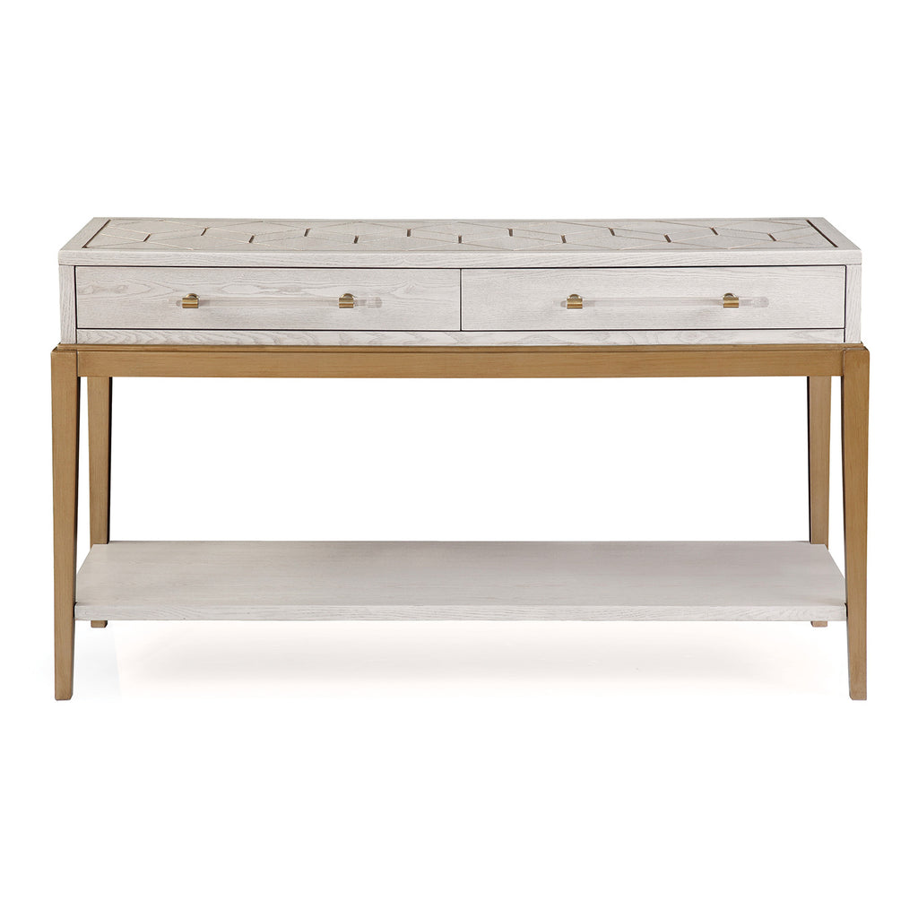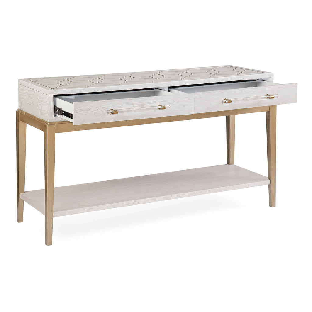 The Perrine White Console Table embodies transitional styling, offering a charming addition to your living space. Its soft white finish on flat cut oak veneers is beautifully complemented by a satin brass geometric design on the top and base, along with acrylic bar pulls and satin brass accents on the two drawers. Additionally, it features a convenient bottom shelf, combining both style and practicality seamlessly. The combination of finishes and materials brings an authentic touch to your home decor.