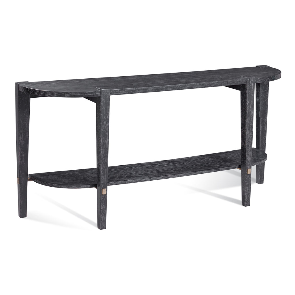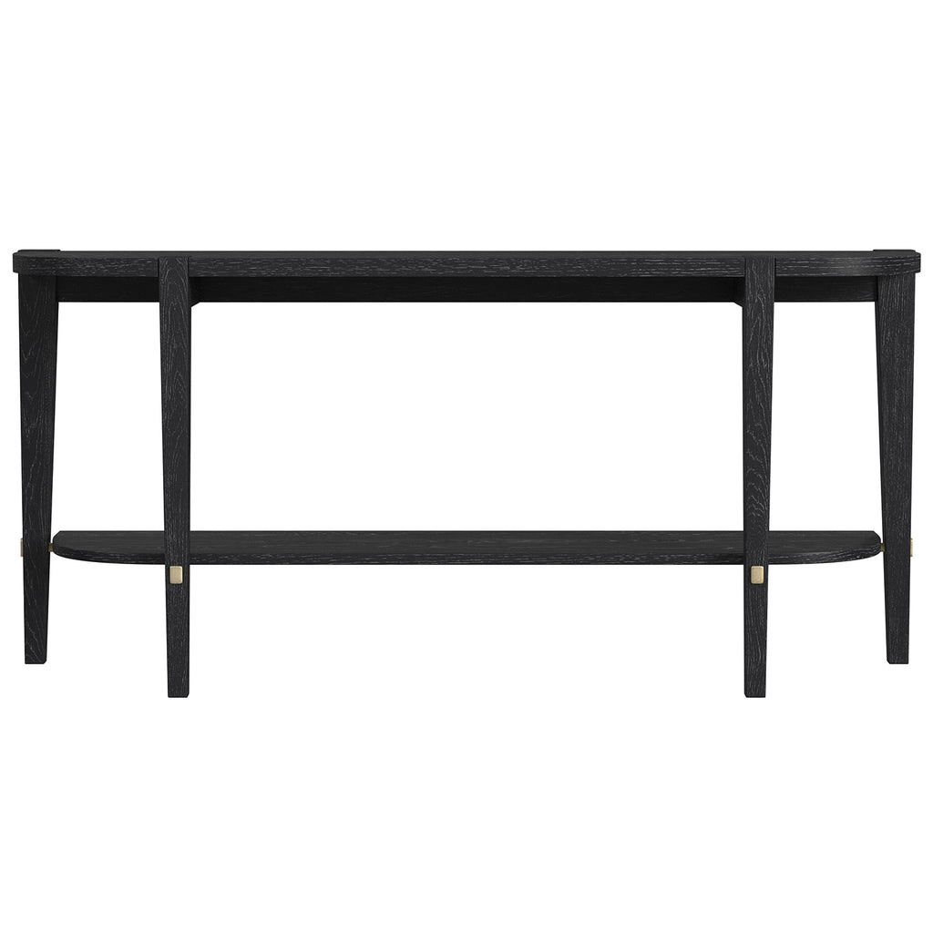 The Whitfield Console has a modern style. The legs and top feature an interlocking design, constructed with rubberwood solids and flat-cut, cerused oak. The table is finished in a black stain with generous white wax hang-up in the open grain. Brushed gold cross bars accent the base, piercing through the legs.