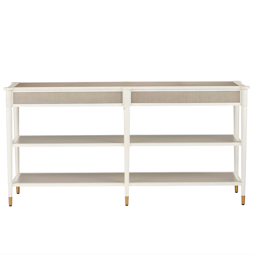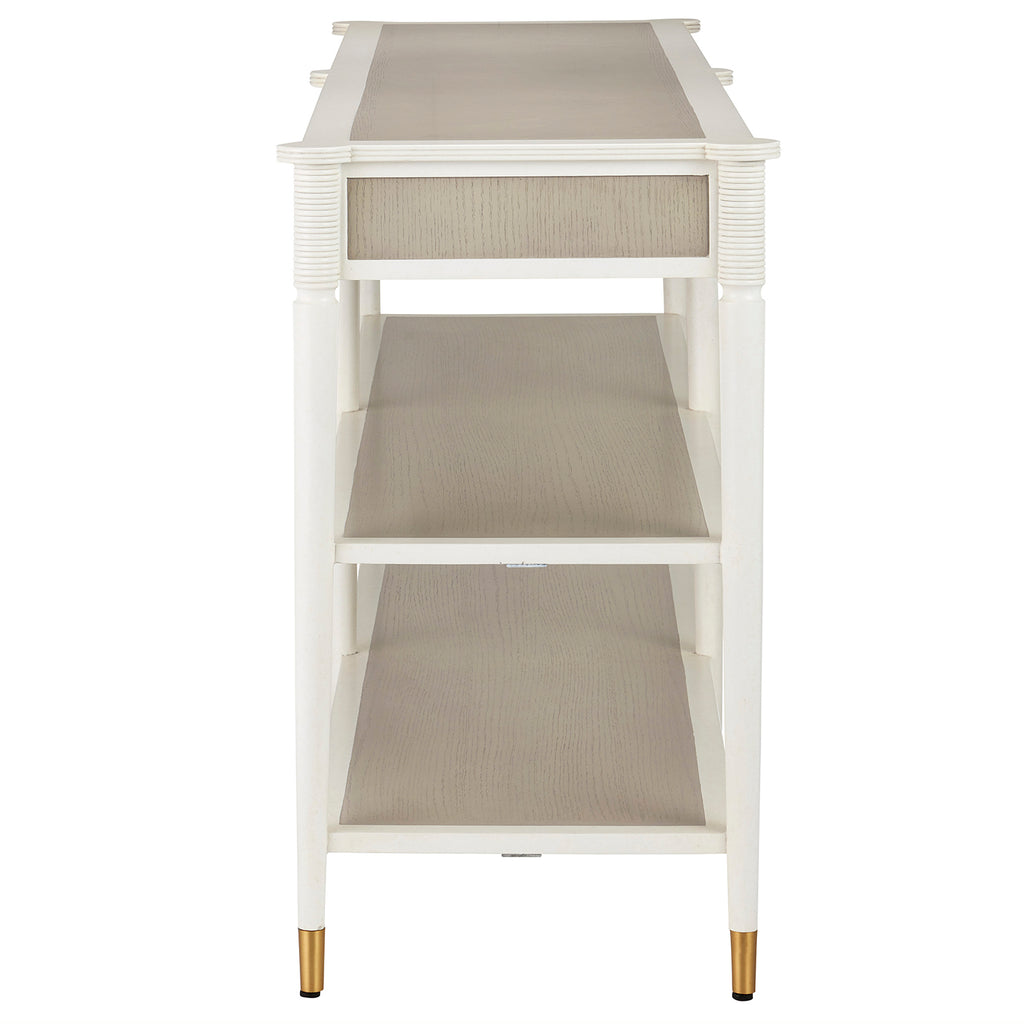 Made of mahogany and oak in a mix of off-white and fog finishes, the Currey & Co Aster Console Table was inspired by an antique from the Winterthur Museum. The gray and white console table has two shelves and is fitted with polished brass ferrules. This piece is in the Winterthur Collection.